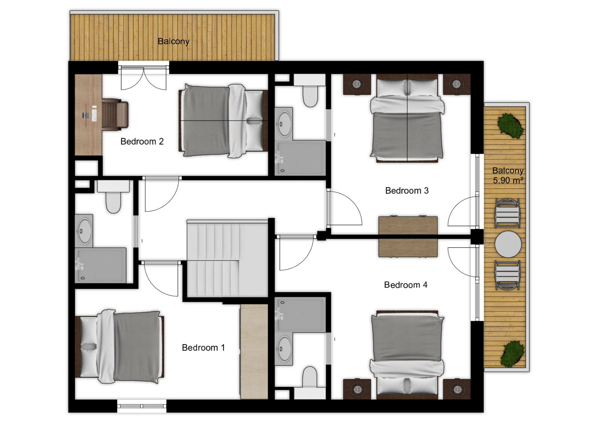 BEDROOMS Bedroom 1: Beds : Double bed only Shared Shower Room with bedroom 2 Bedroom 2: Beds : Double / Twin configuration possible Shared Shower Room with bedroom 1 Bedroom 3: Beds : Double / Twin configuration possible Ensuite shower room Bedroom 4: Beds : Double bed only Ensuite shower room