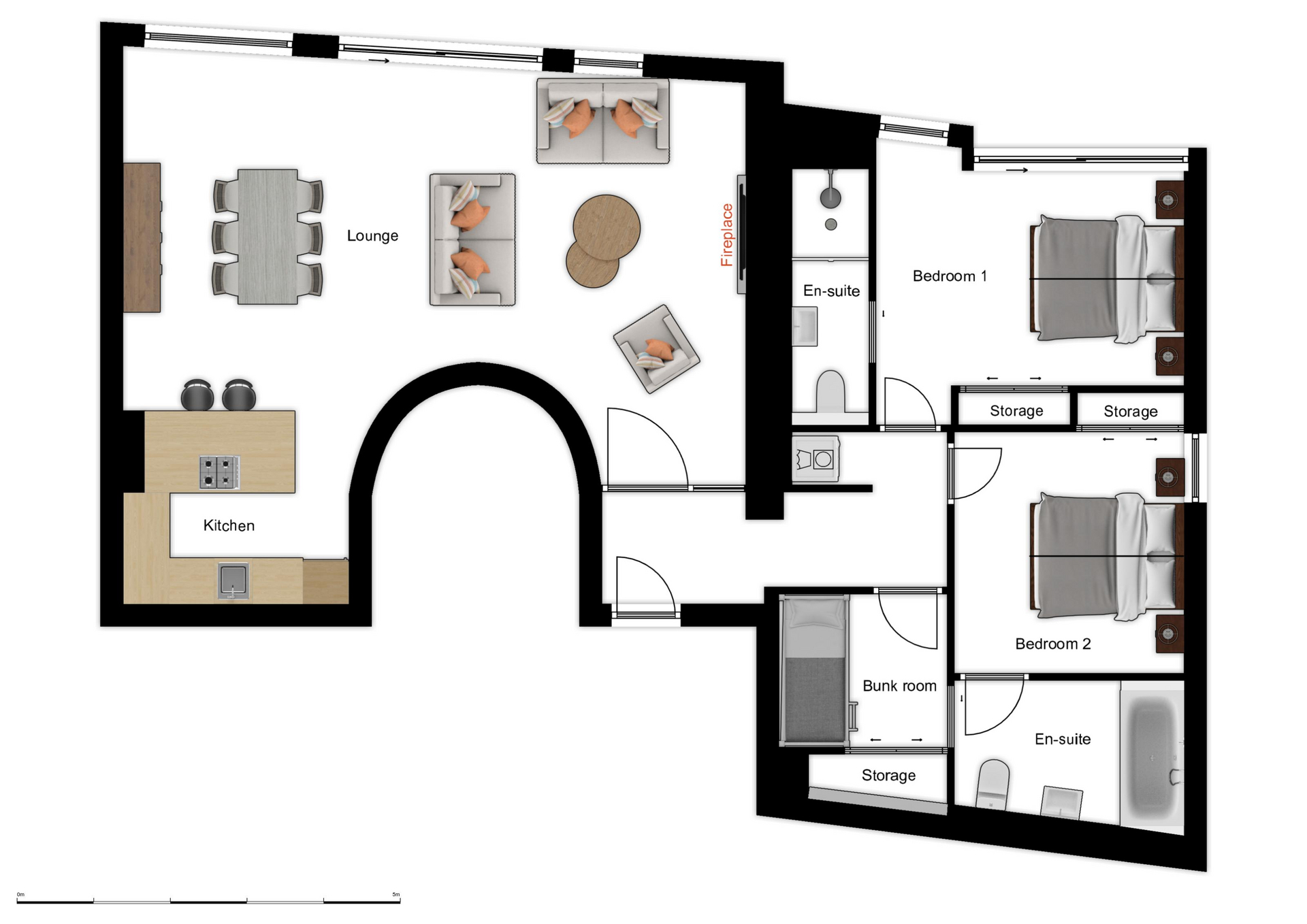 The Bedrooms are luxurious and comfortable. There are three bedrooms in total, two of which can be configured as doubles or twin rooms. The third bedroom is a spacious bunk room (no window) with stylish lighting and a cosy feel. The master suite, bedroom 1 is the largest and has a full ensuite shower room plus a balcony with views of the Pleney slopes. The Bunk room is next to Bedroom 2 and also shares an additional family bathroom.