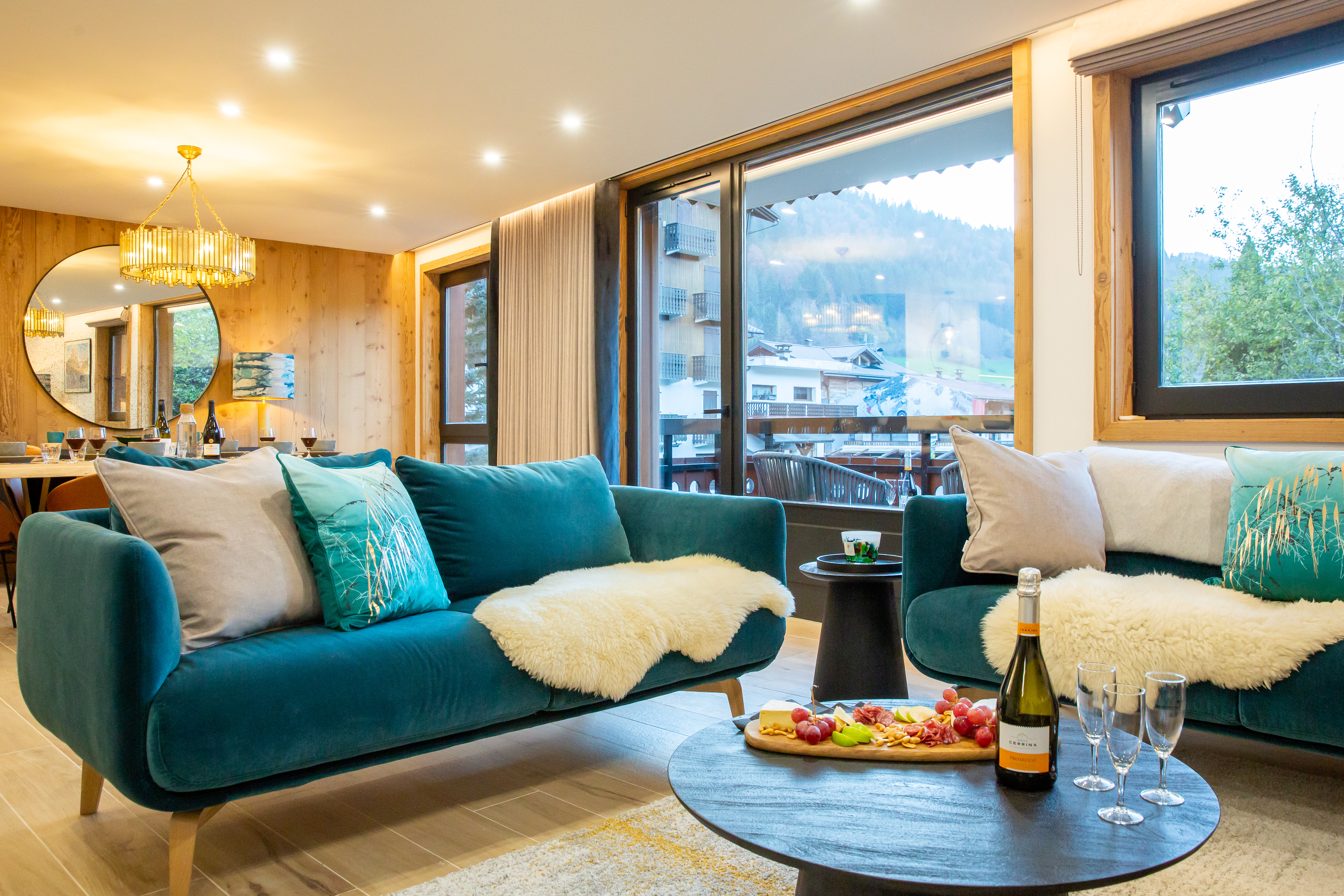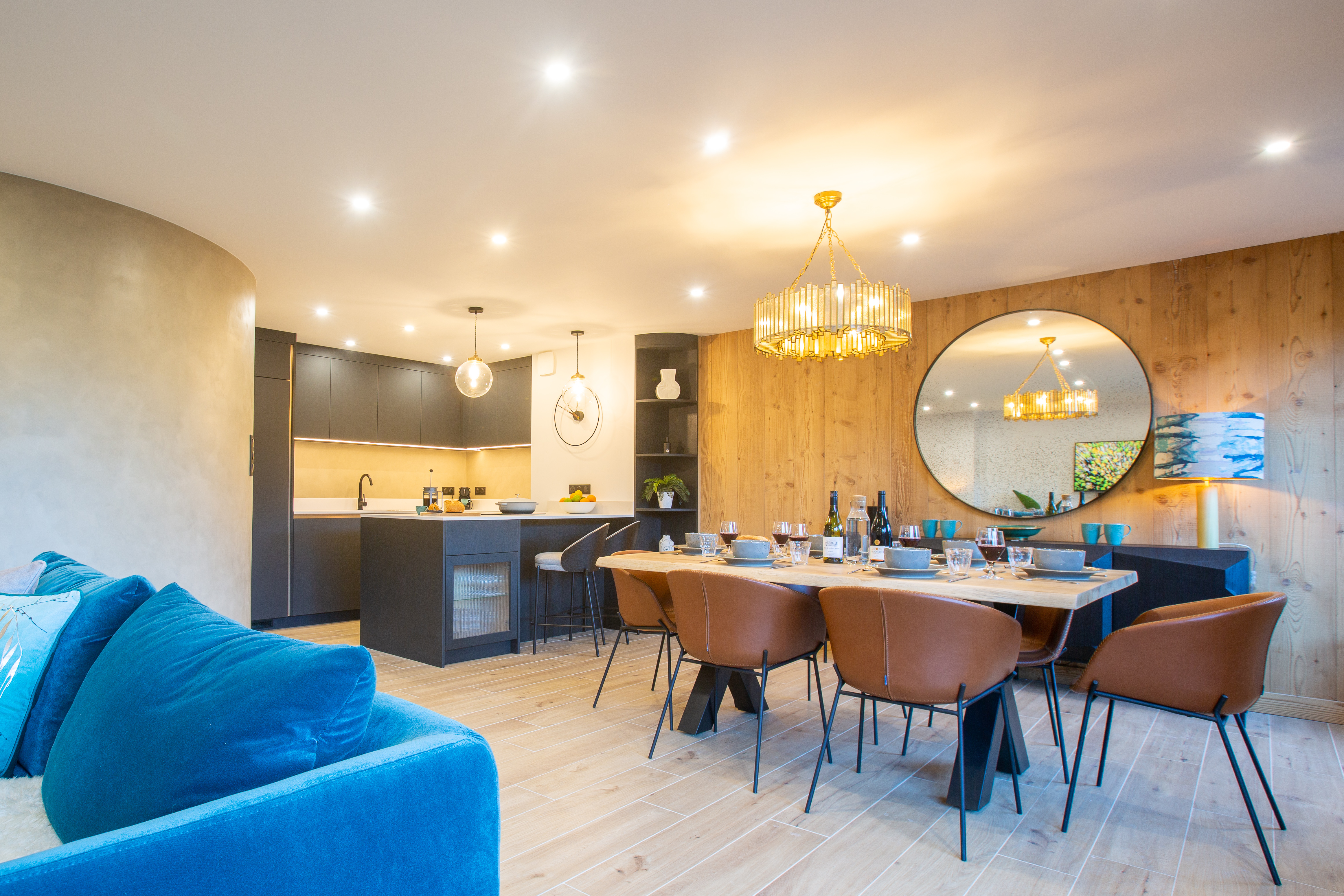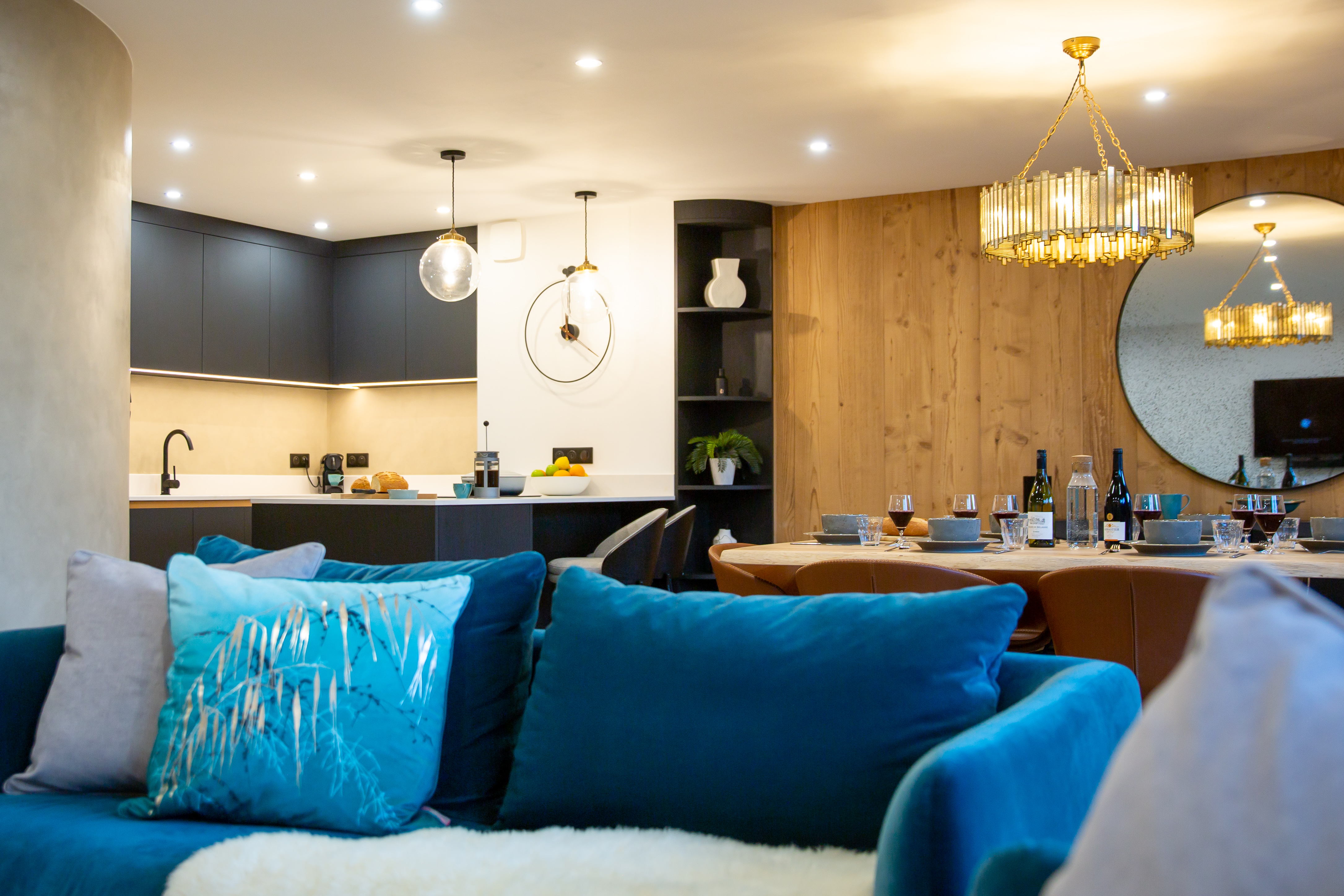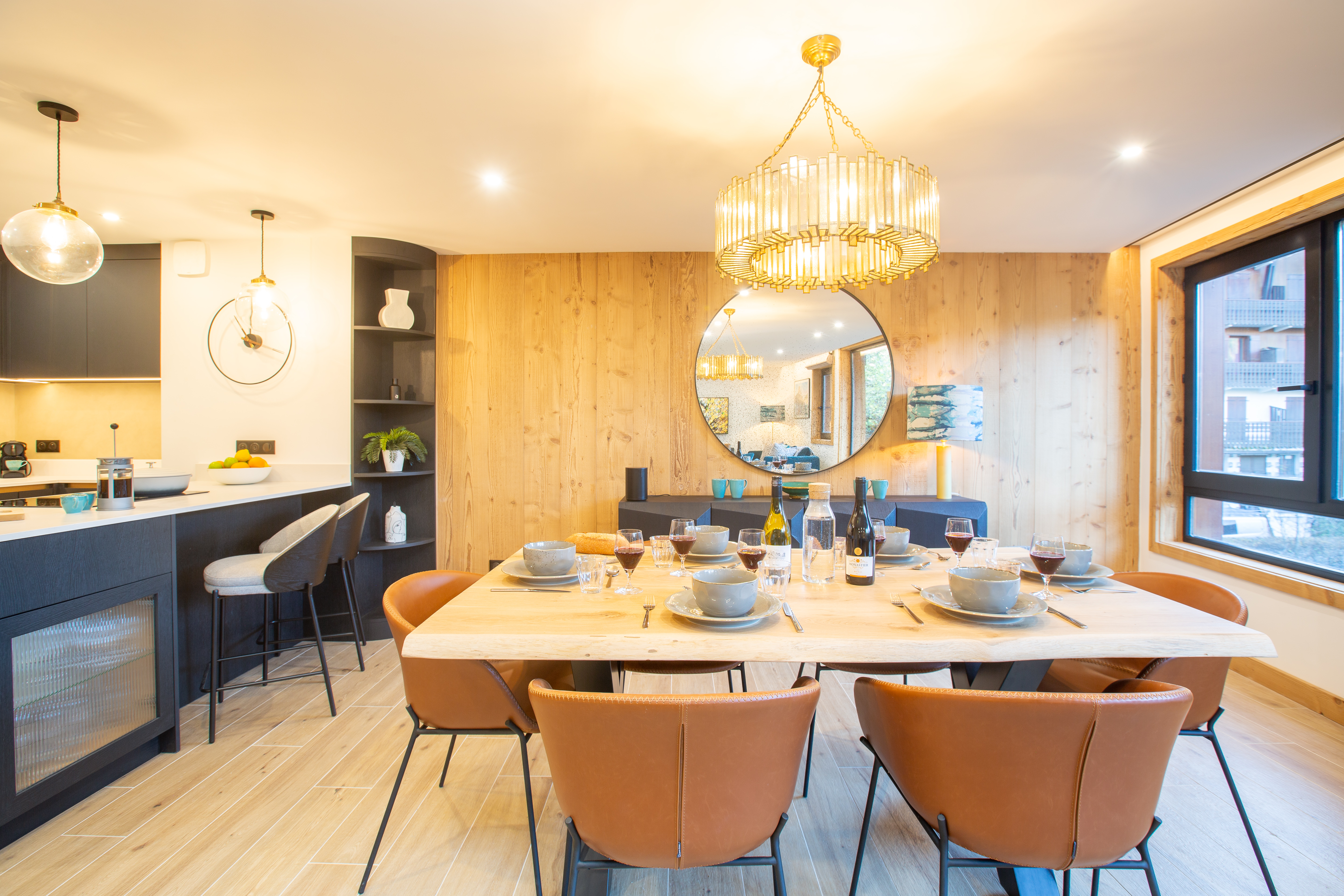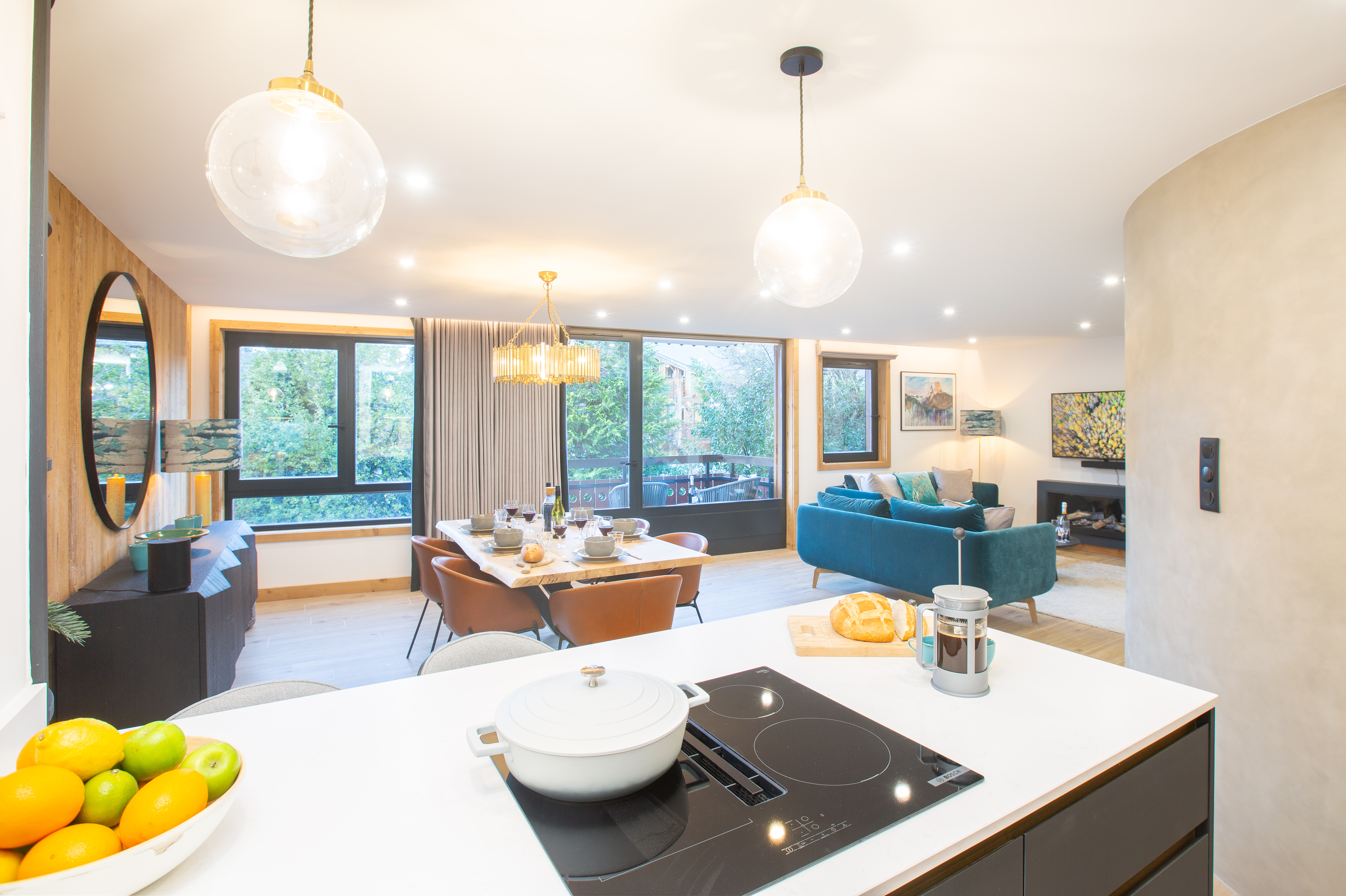 Apartment Demi Lune was recently refurbished by leading interiors specialist RS interiors. A fantastic size in general, the whole apartment has been meticulously planned with all mod cons and every detail has been considered. There is a large open plan living space, feature curved walls and crittal glass doors which make it feel really light and airy. Offering plenty of space for 6 people, there is a large dining table, modern kitchen, comfortable sofa area with LED electric fireplace and large balcony.