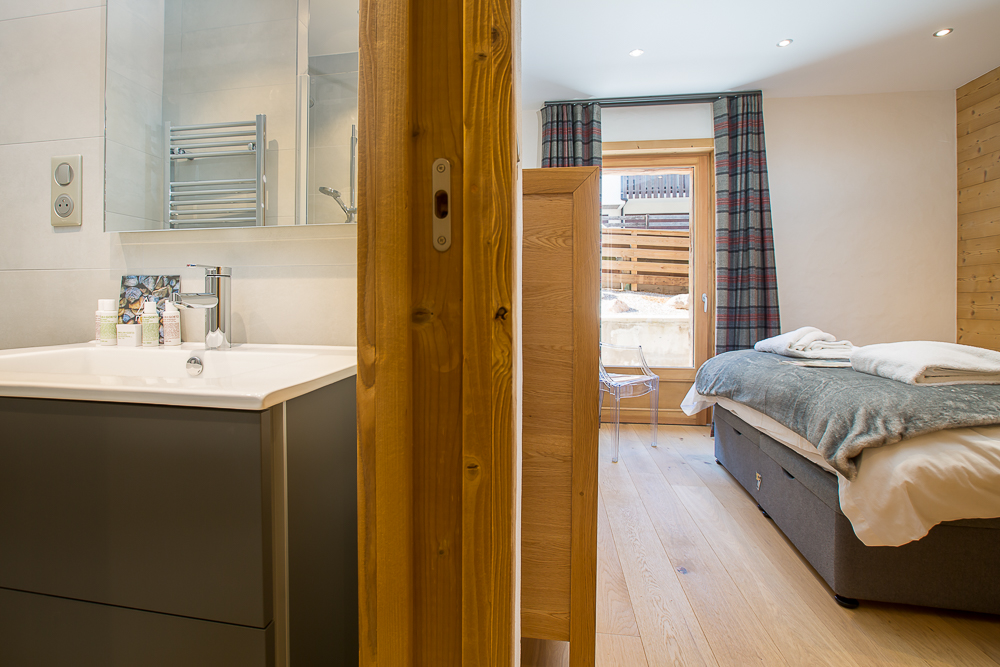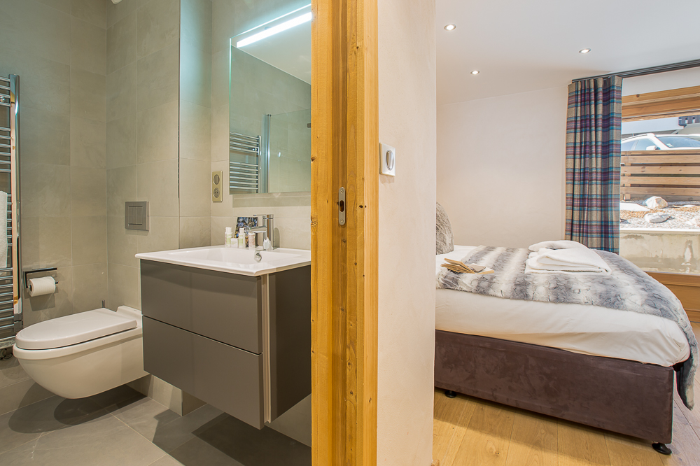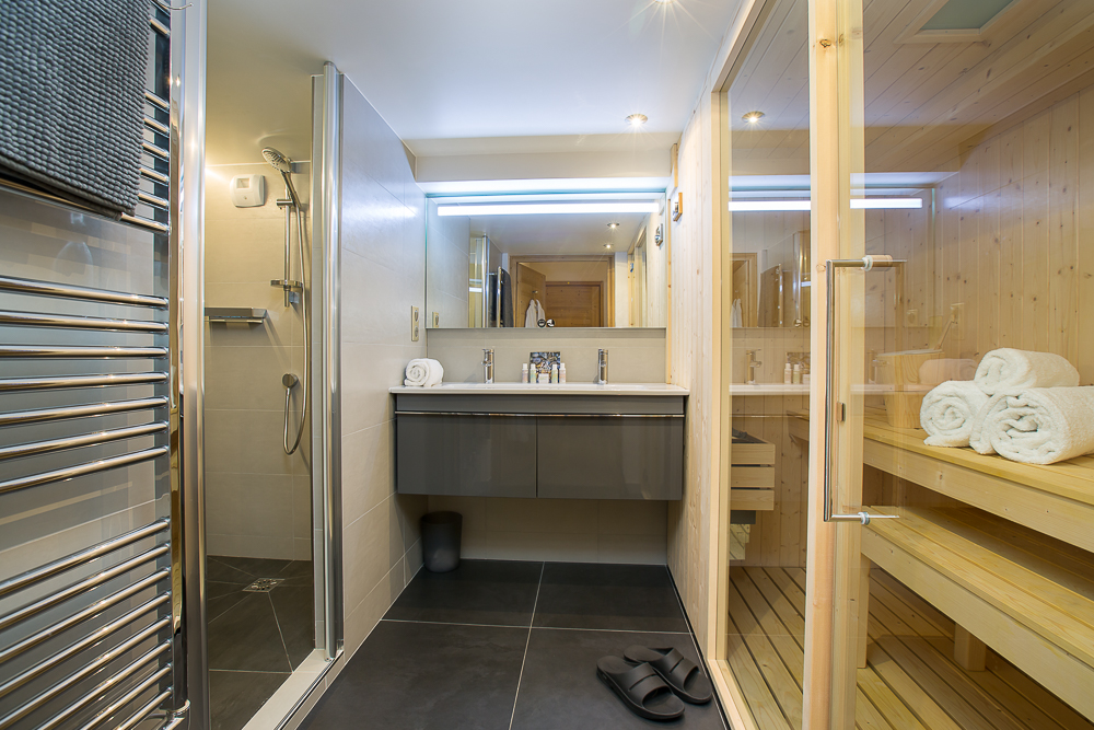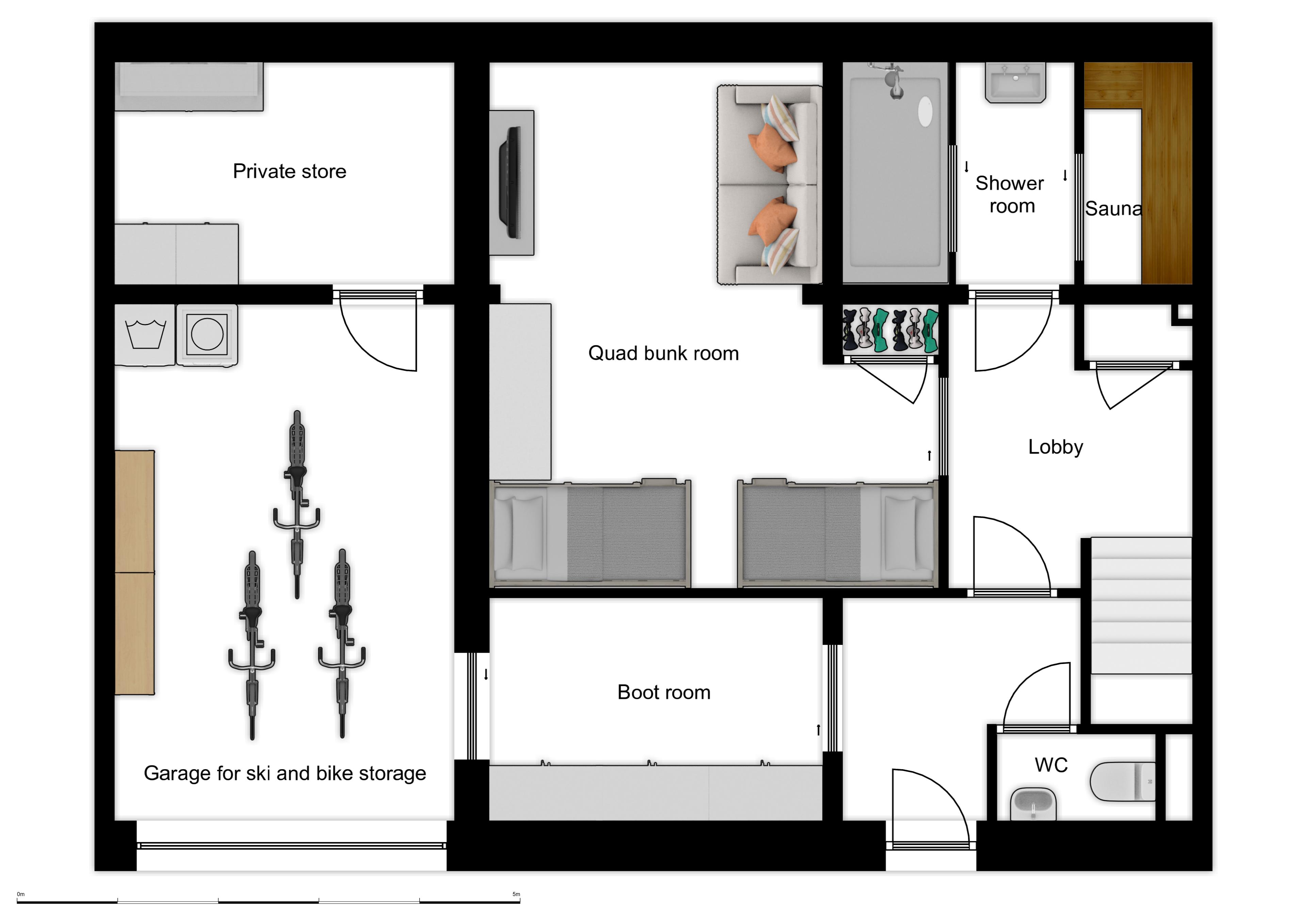 The ground floor and entrance has a large ski/boot room with boot dryers and a garage for bikes. There is a washing machine and dryer room at the back of the garage. The large family bedroom has 4 single bunk beds as well as an additional TV and games console. There is a sauna with a shower and a separate toilet.