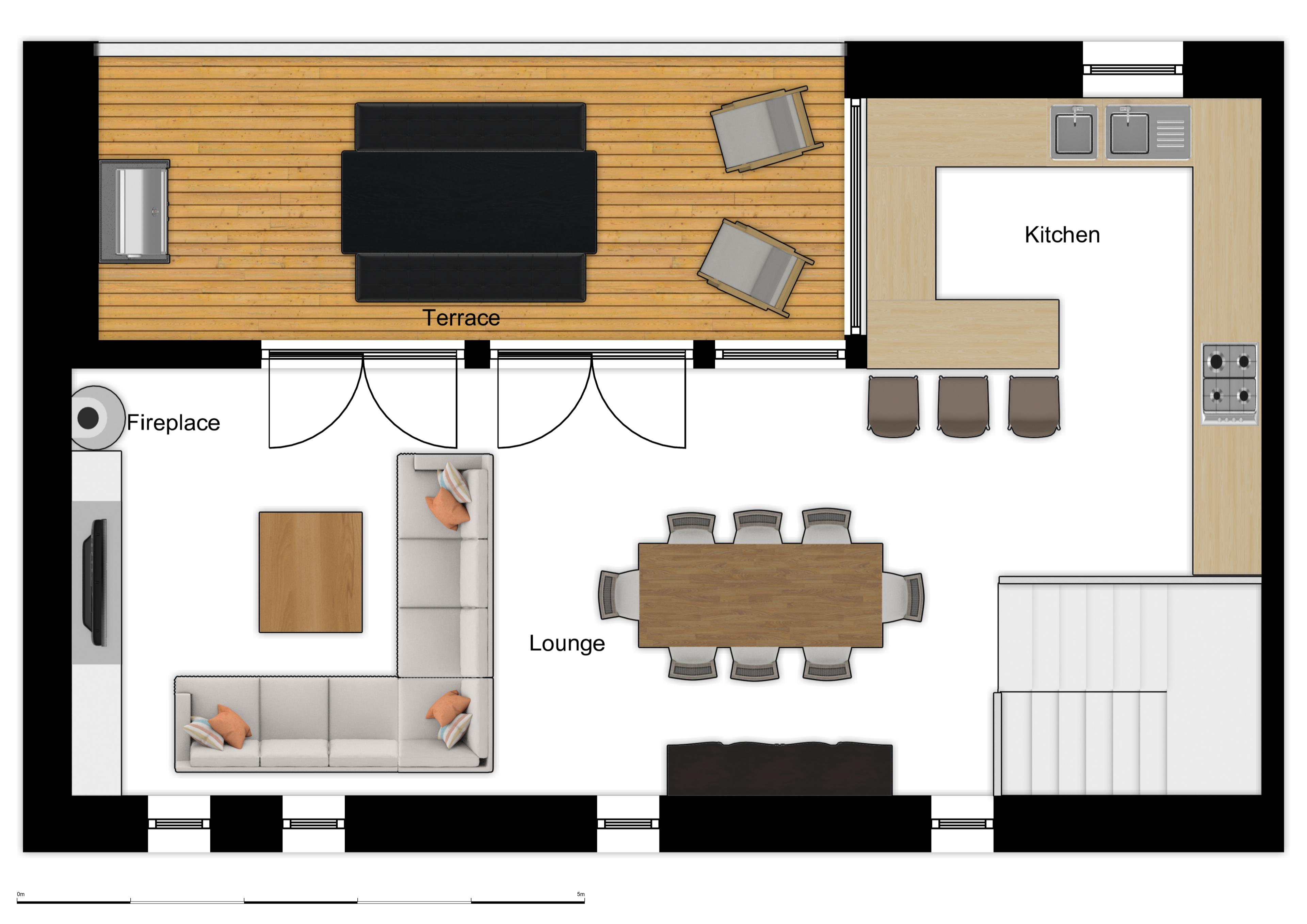 The main living area is on the top floor with beautiful beams, large floor to ceiling windows, log burning stove and corner sofa. The modern kitchen comes fully equipped with oven, dishwasher and large fridge freezer. There is a large outdoor terrace with dining space, sofas and BBQ.