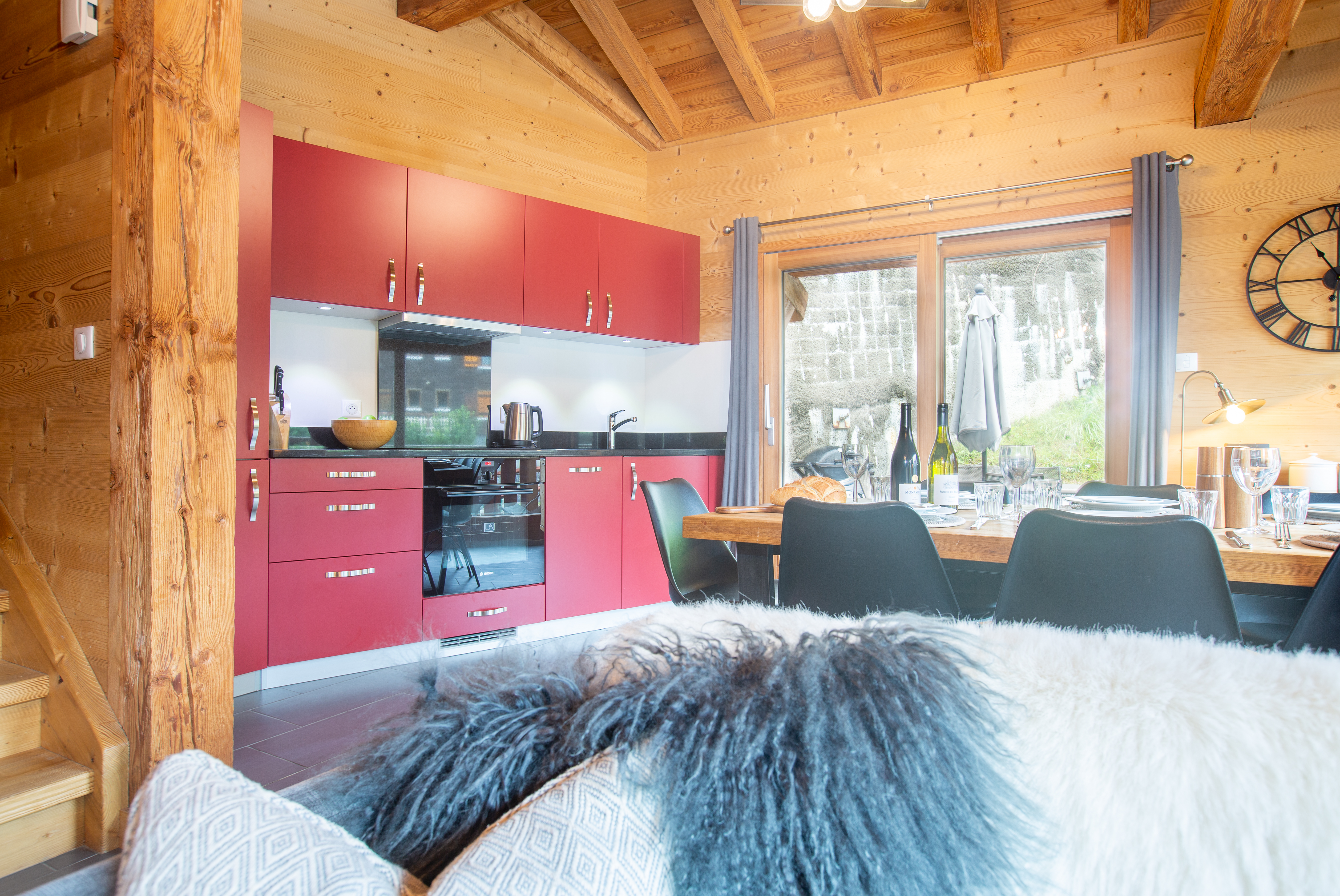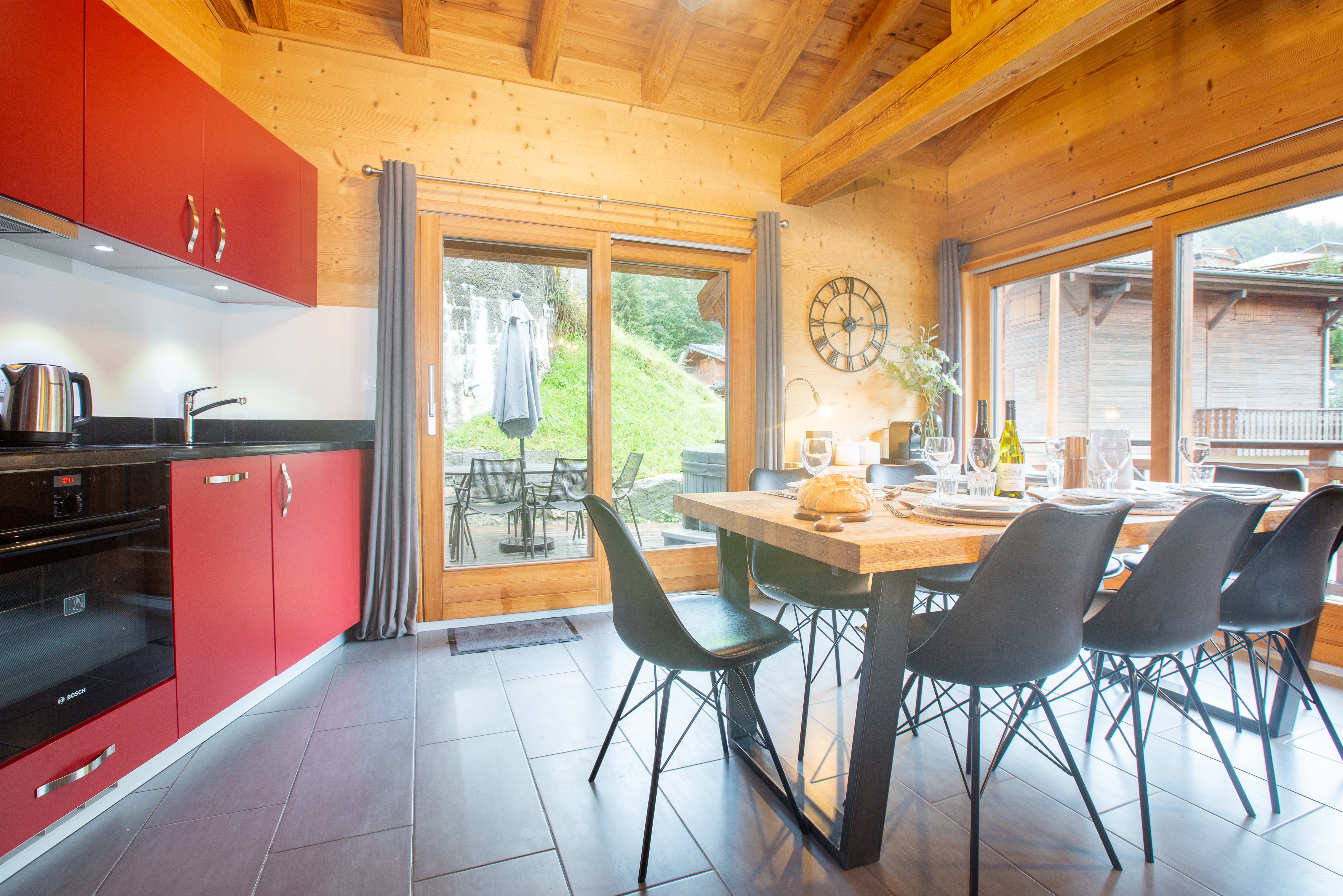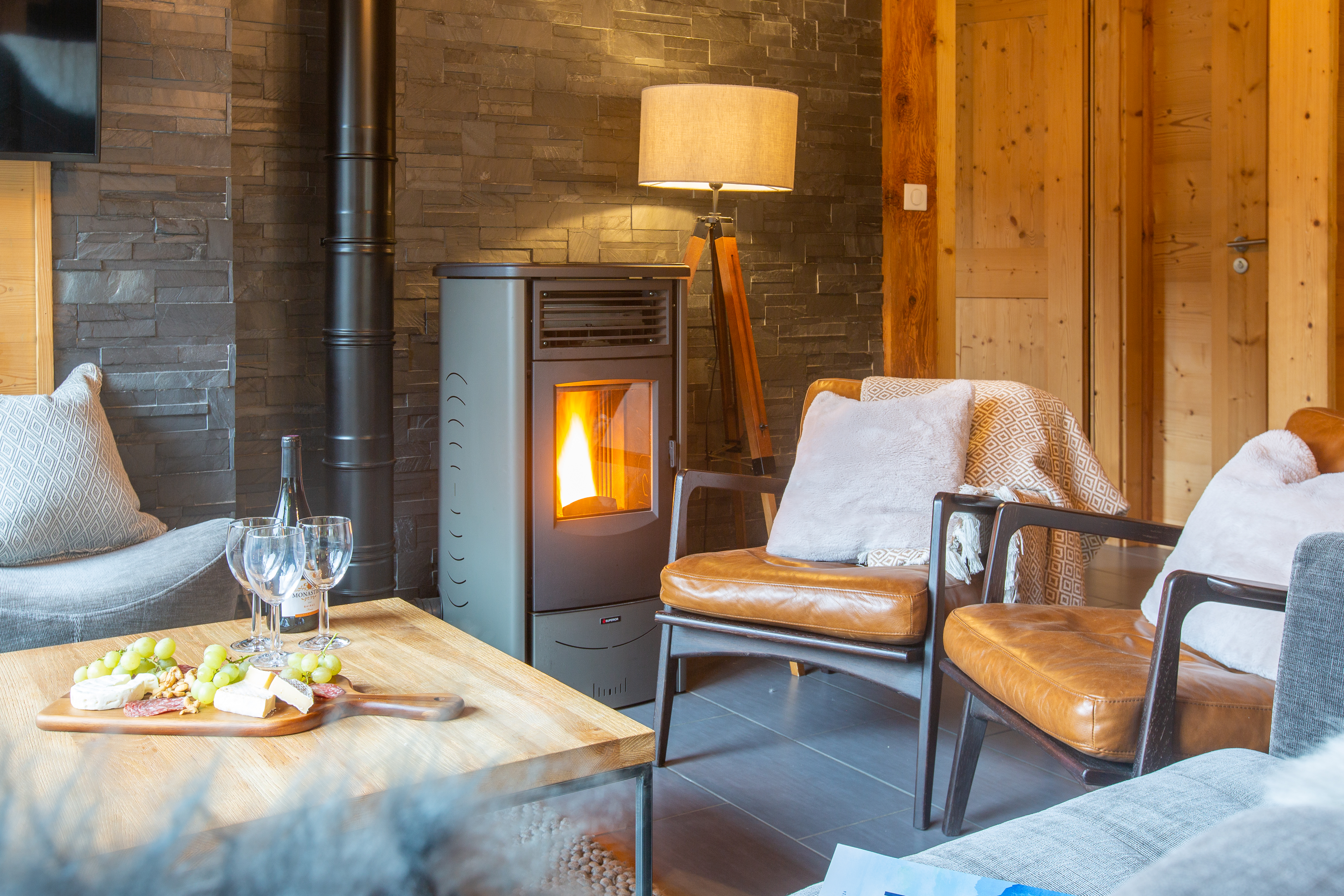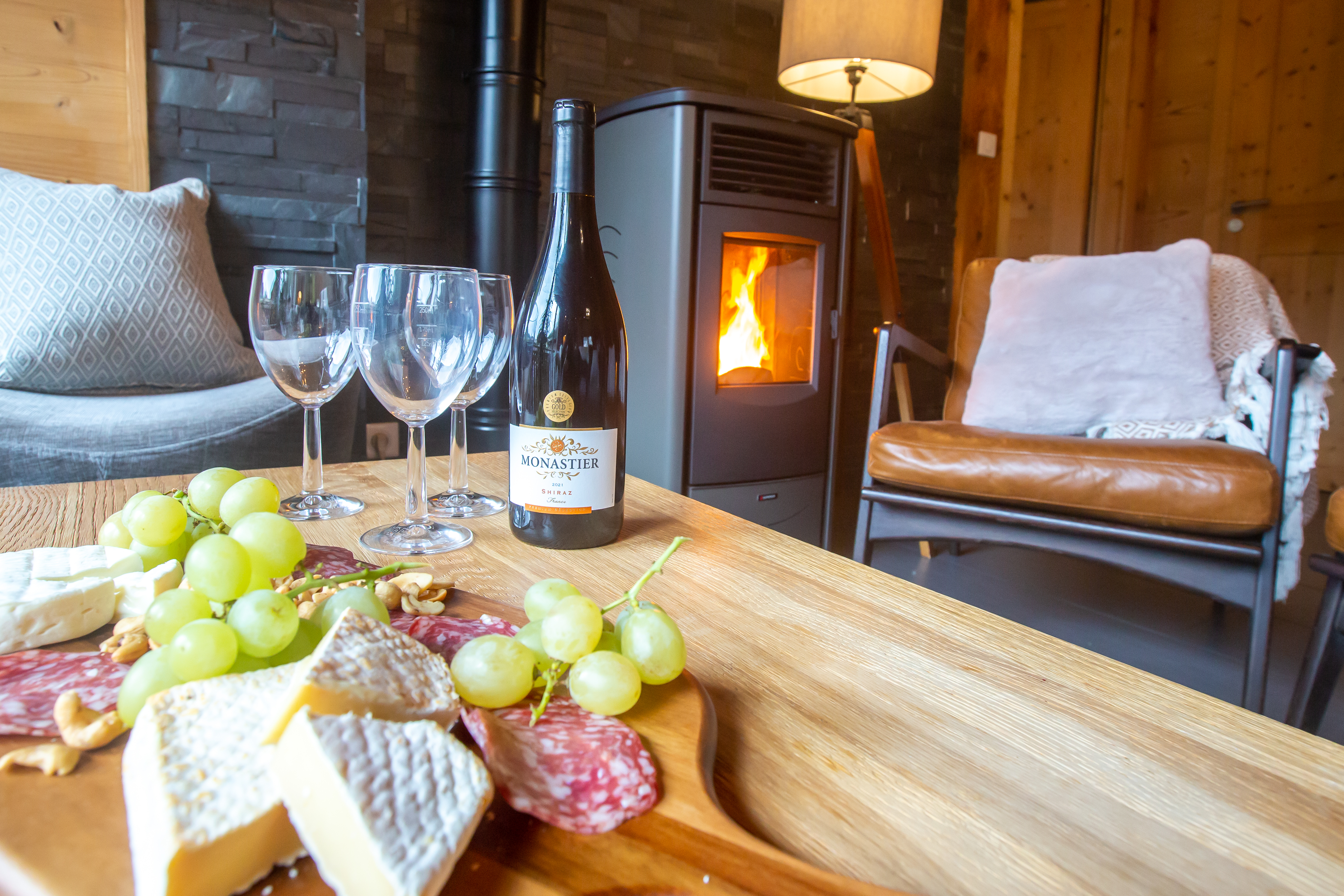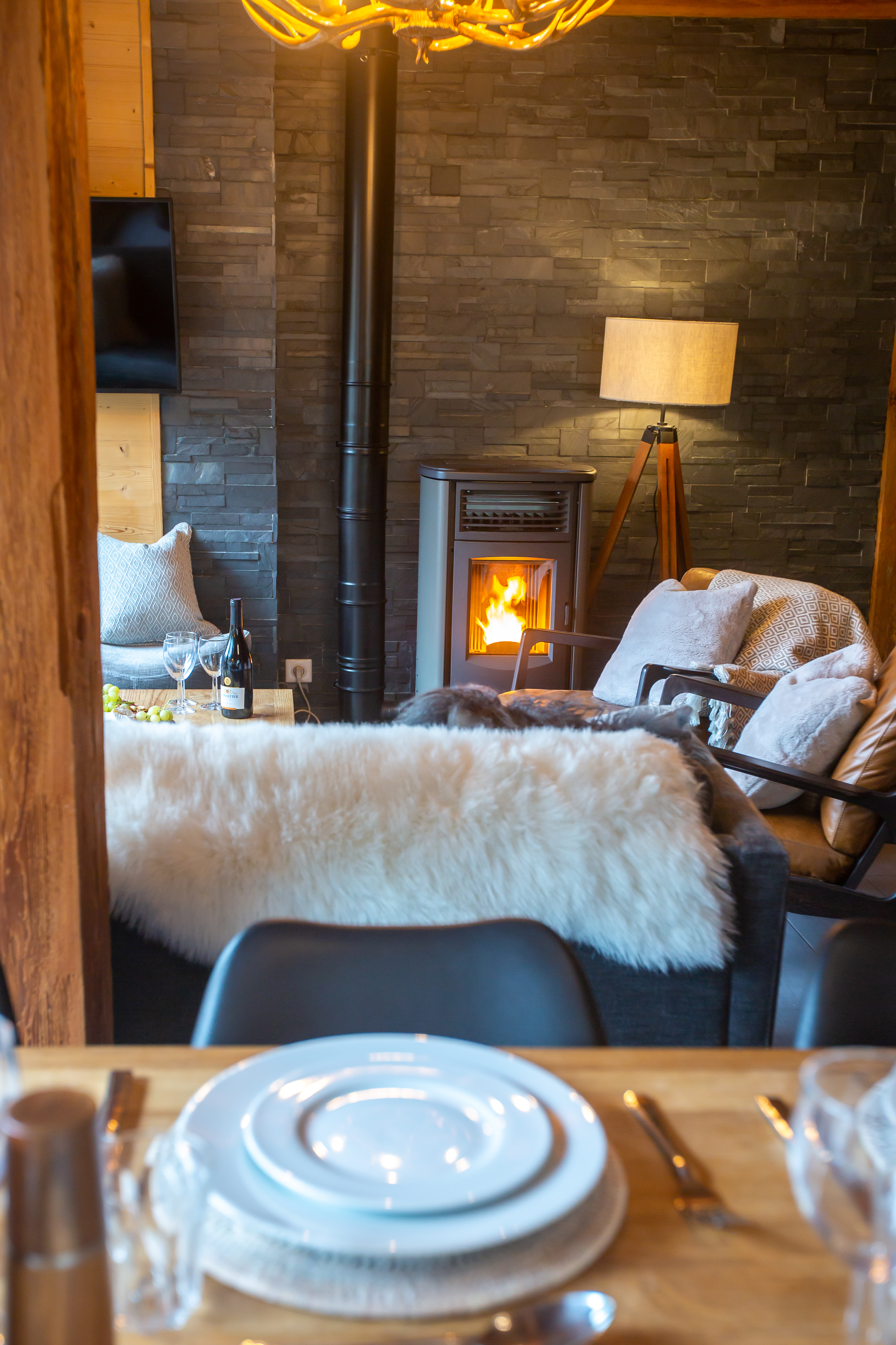 Upstairs is the open plan living space with sliding doors onto the south facing balconies. The lounge features an eco friendly wood pellet stove, Bose Speaker and large flatscreen TV with UK and French TV channels, and Free WiFi. The modern kitchen is well equipped with a Nespresso Machine, dishwasher, integrated fridge freezer, oven with induction hob, kettle, and toaster. There is a terrace off the kitchen with a table for outdoor dining, Weber BBQ in summer and outdoor hot tub.
