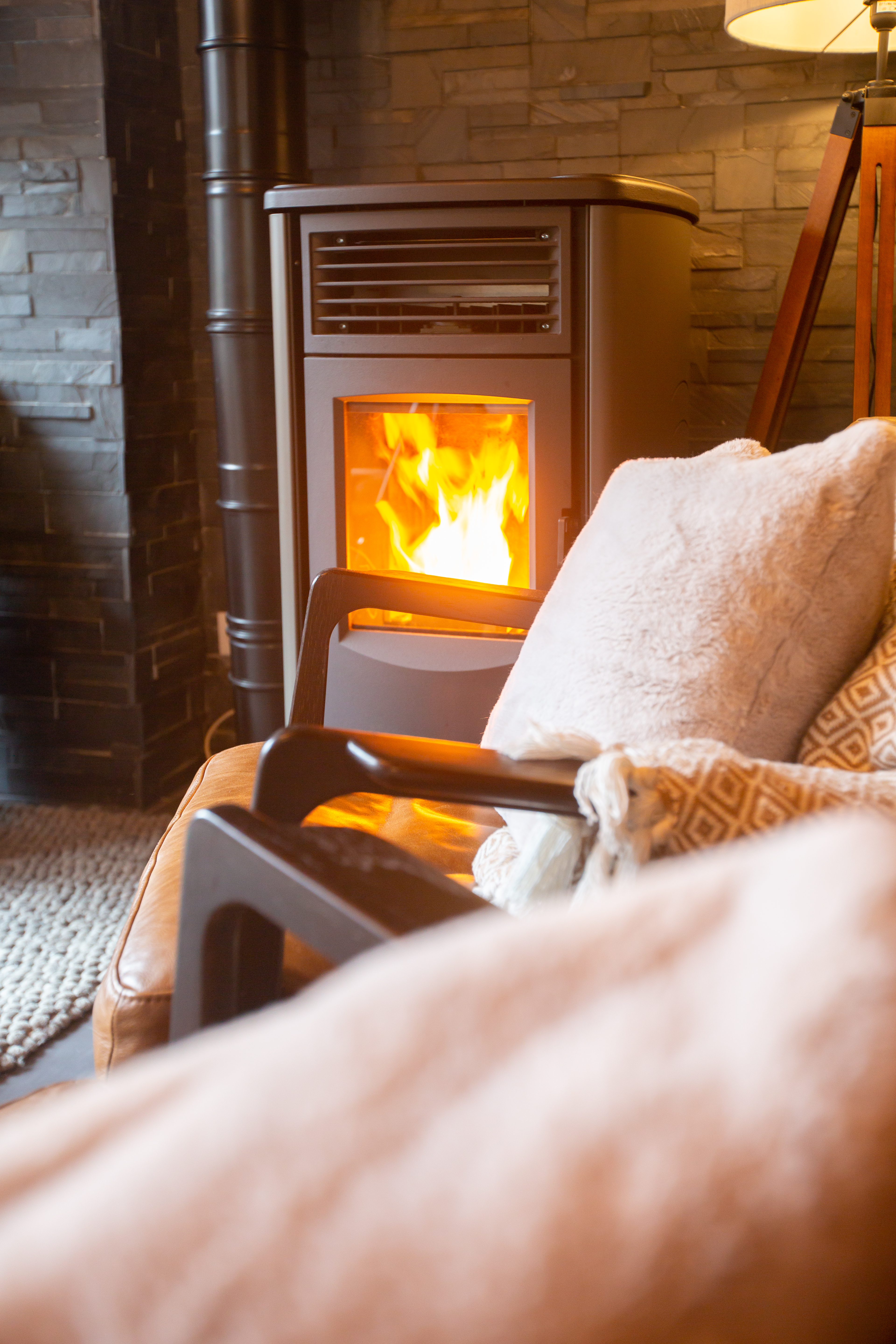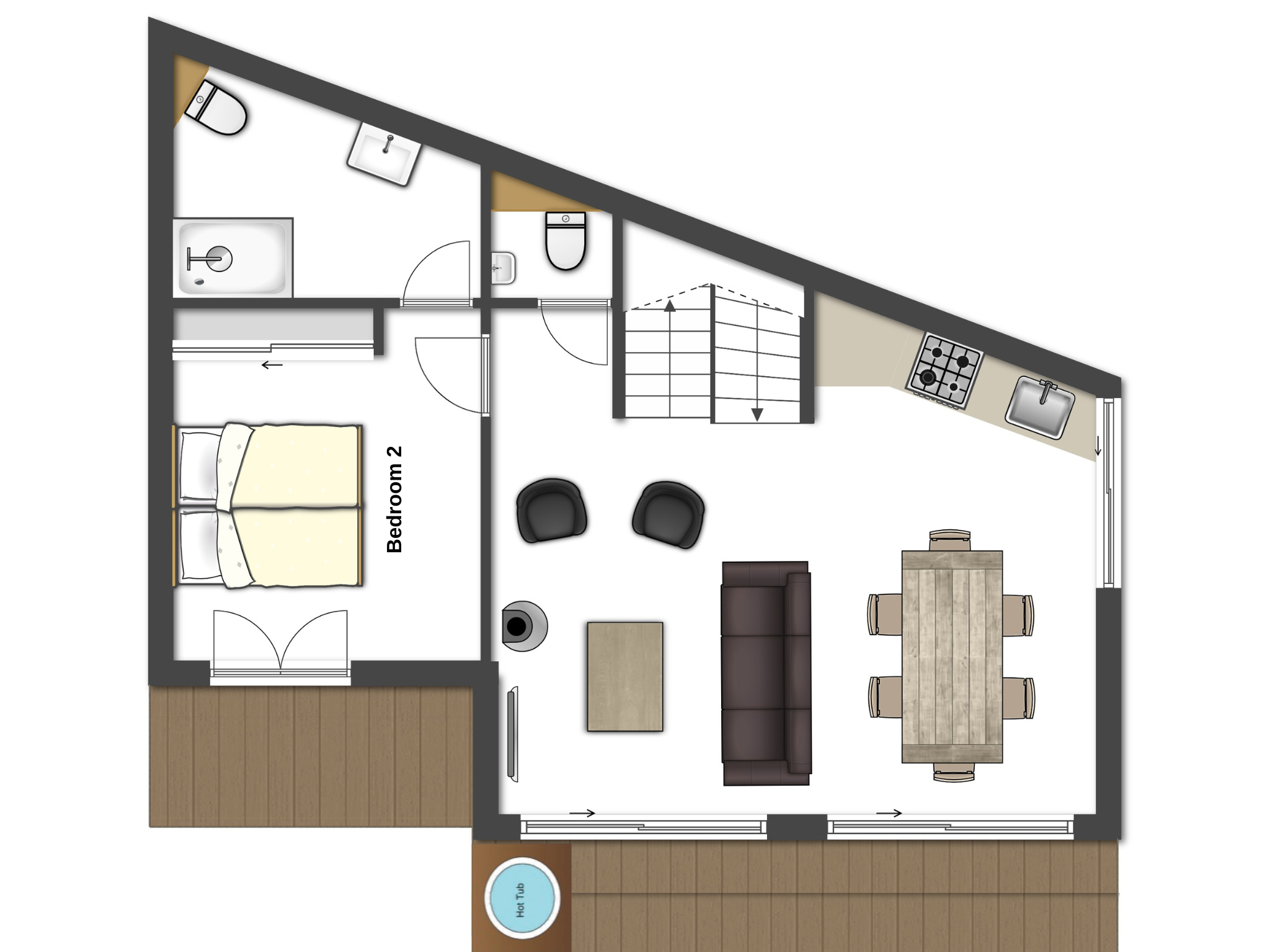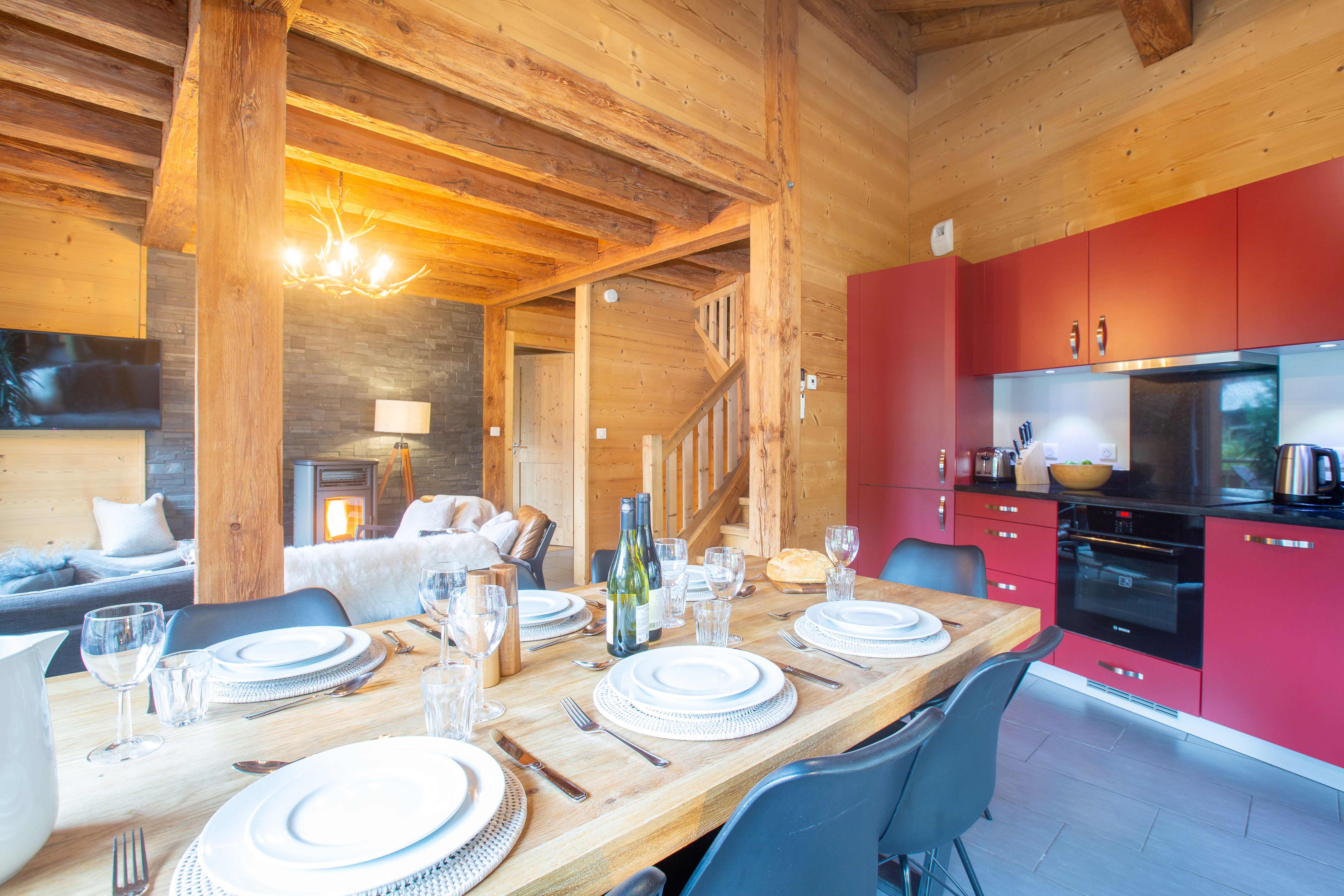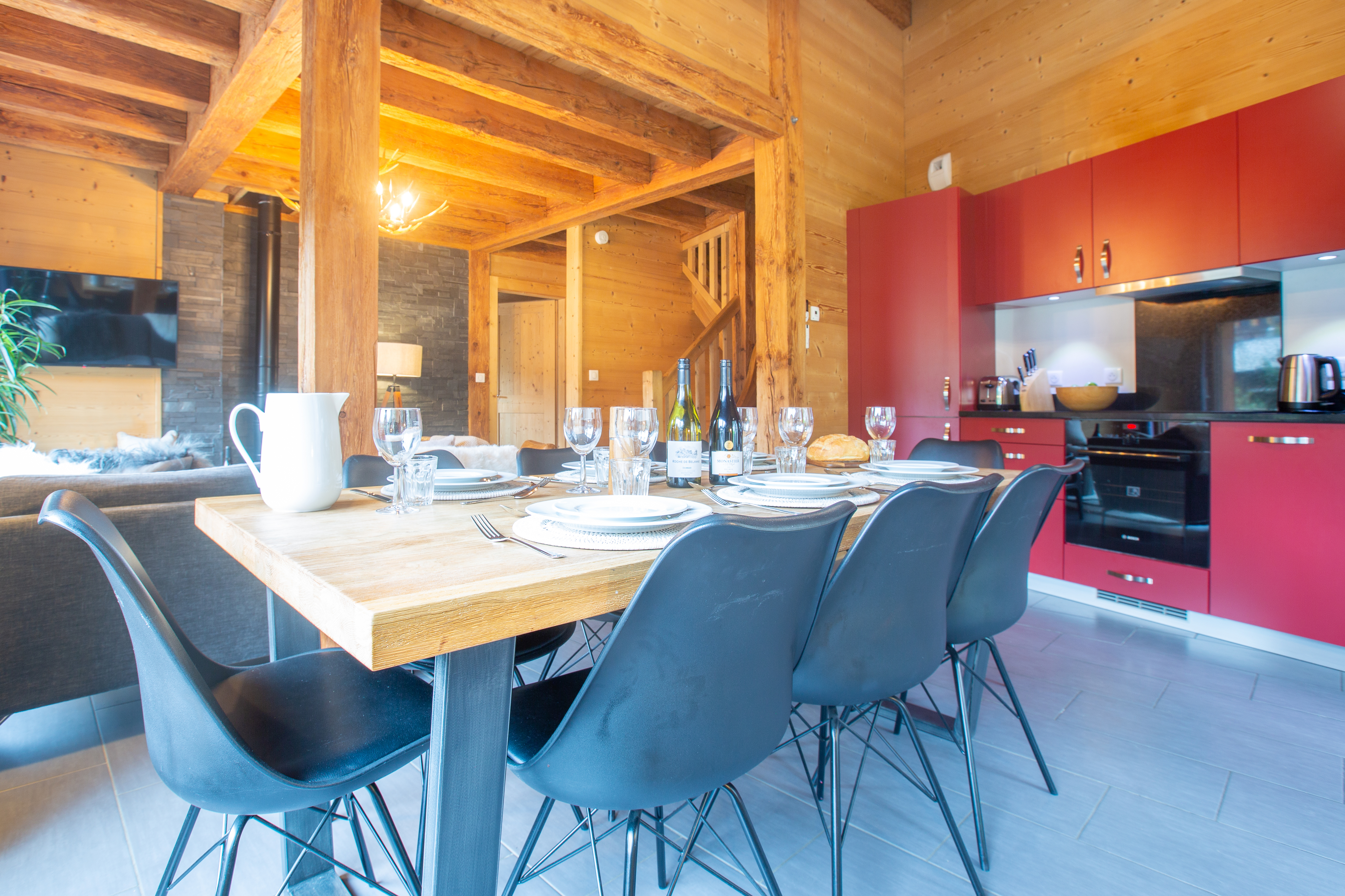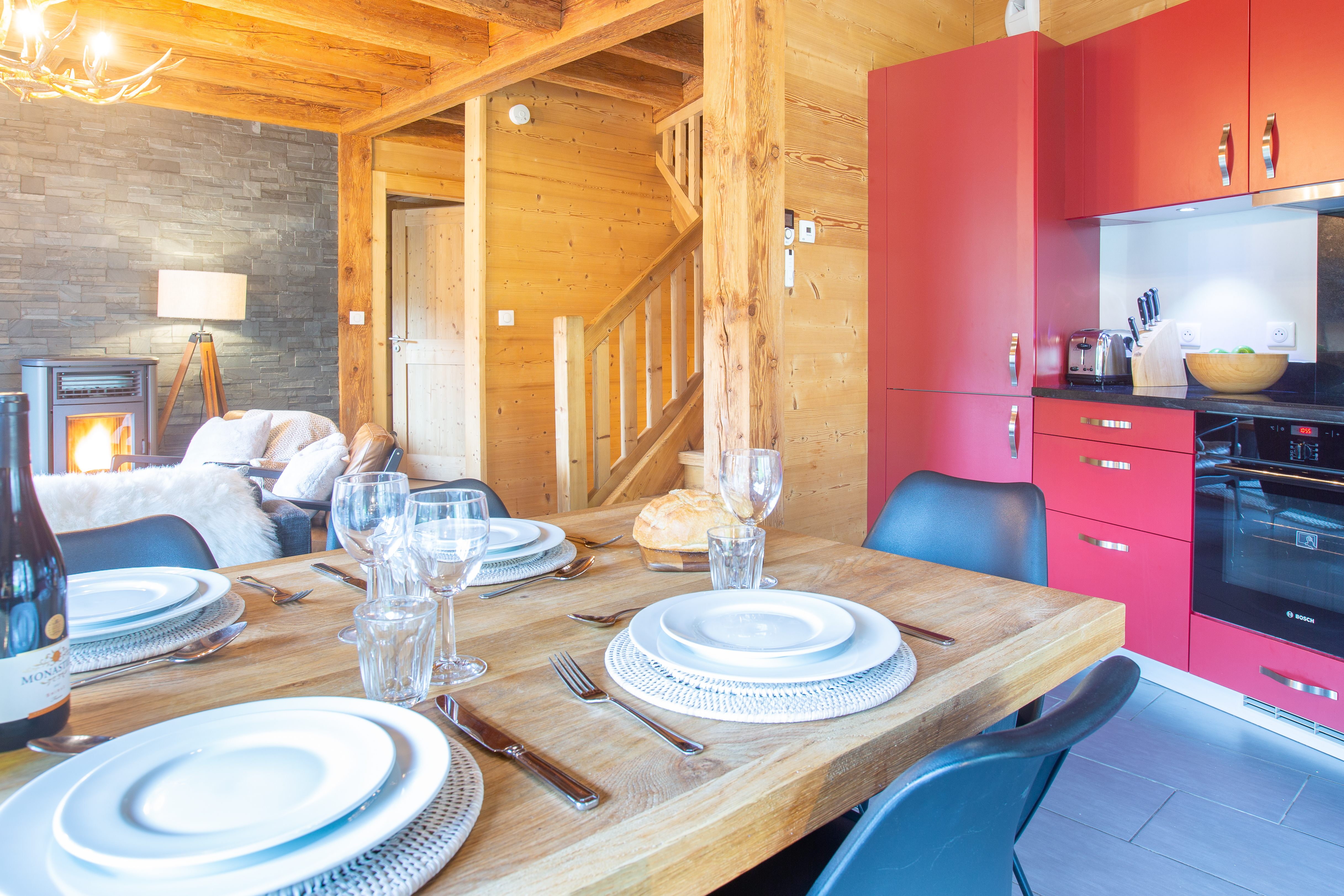 Upstairs is the open plan living space with sliding doors onto the south facing balconies. The lounge features an eco friendly wood pellet stove, Bose Speaker and large flatscreen TV with UK and French TV channels, and Free WiFi. The modern kitchen is well equipped with a Nespresso Machine, dishwasher, integrated fridge freezer, oven with induction hob, kettle, and toaster. There is a terrace off the kitchen with a table for outdoor dining, Weber BBQ in summer and outdoor hot tub.