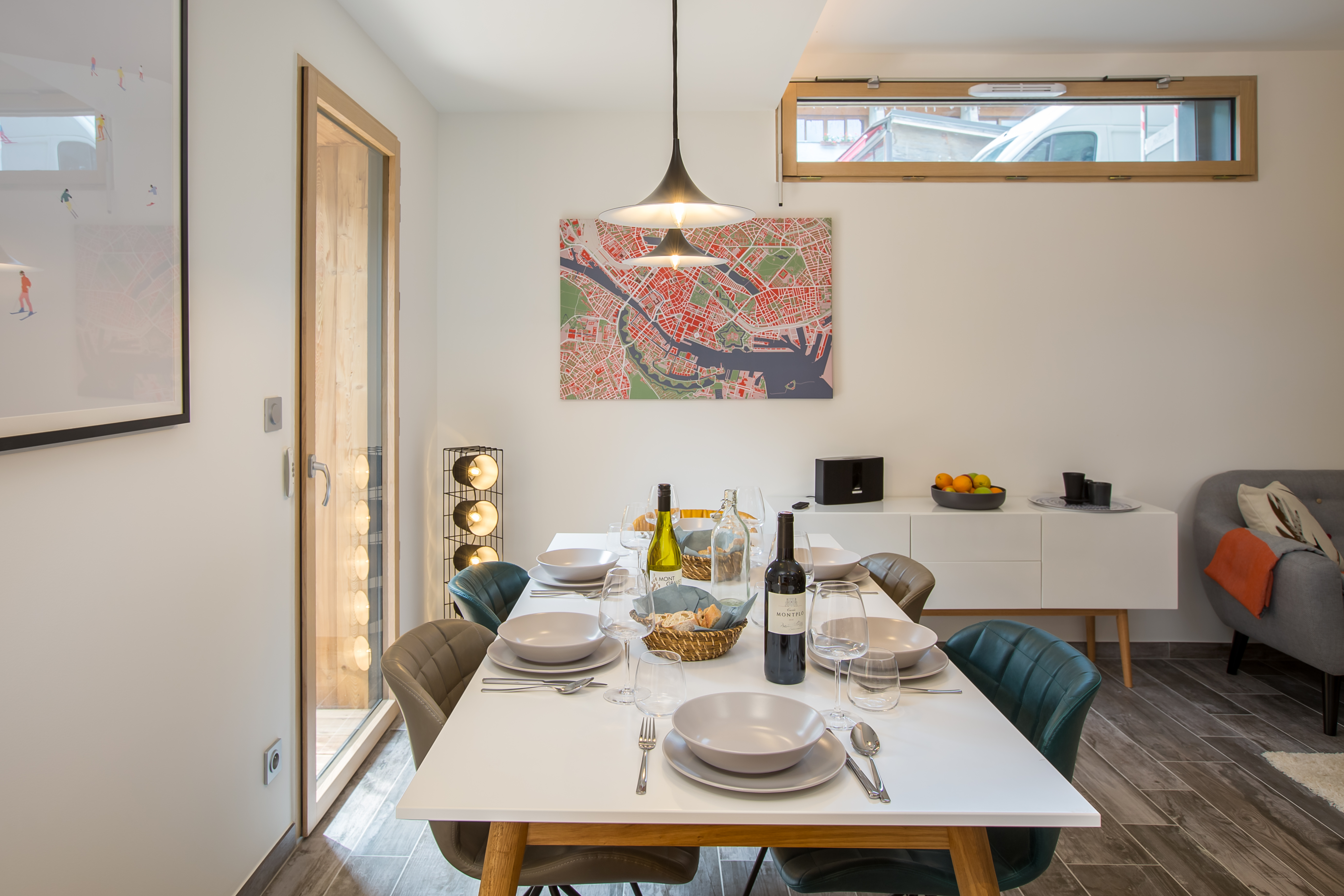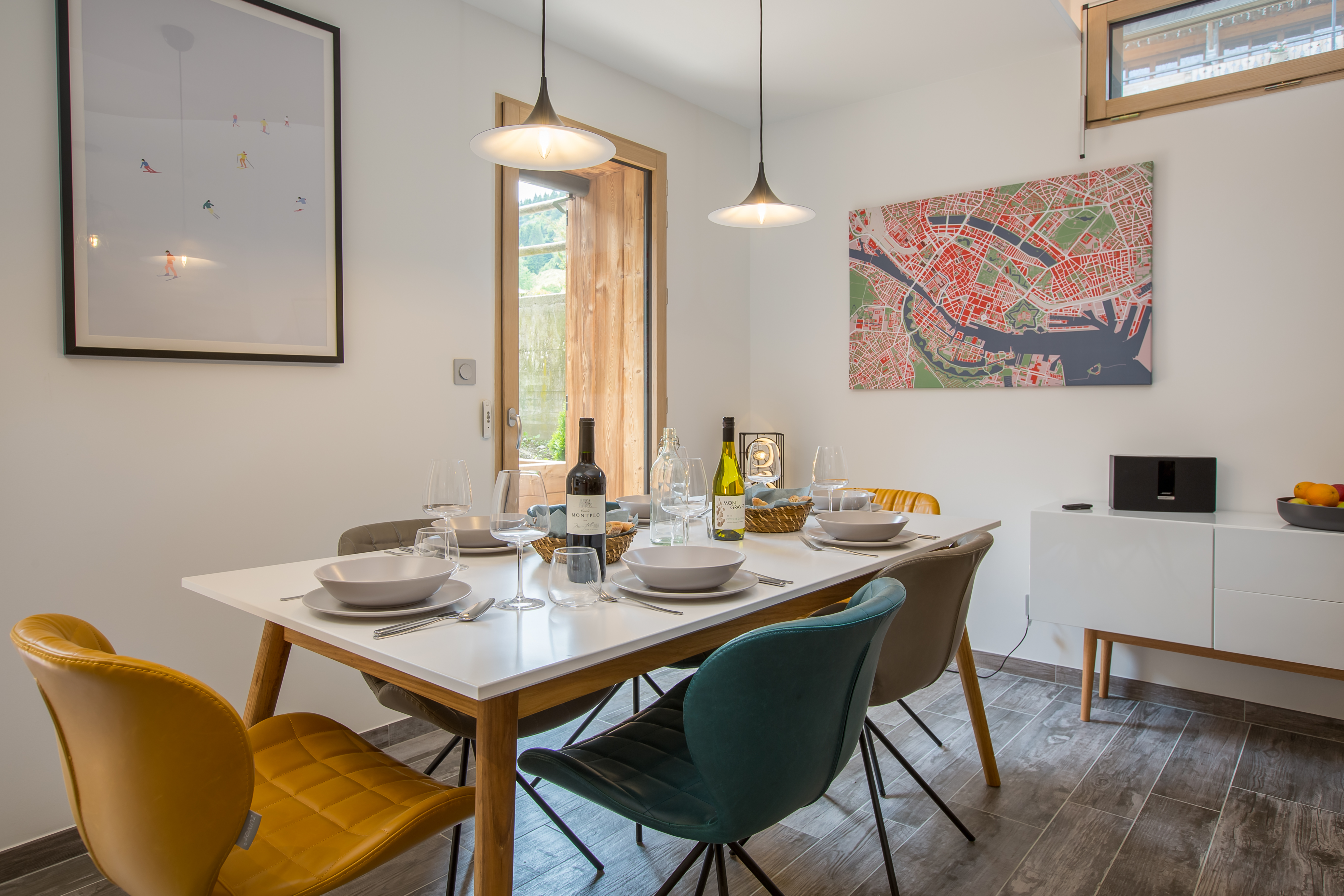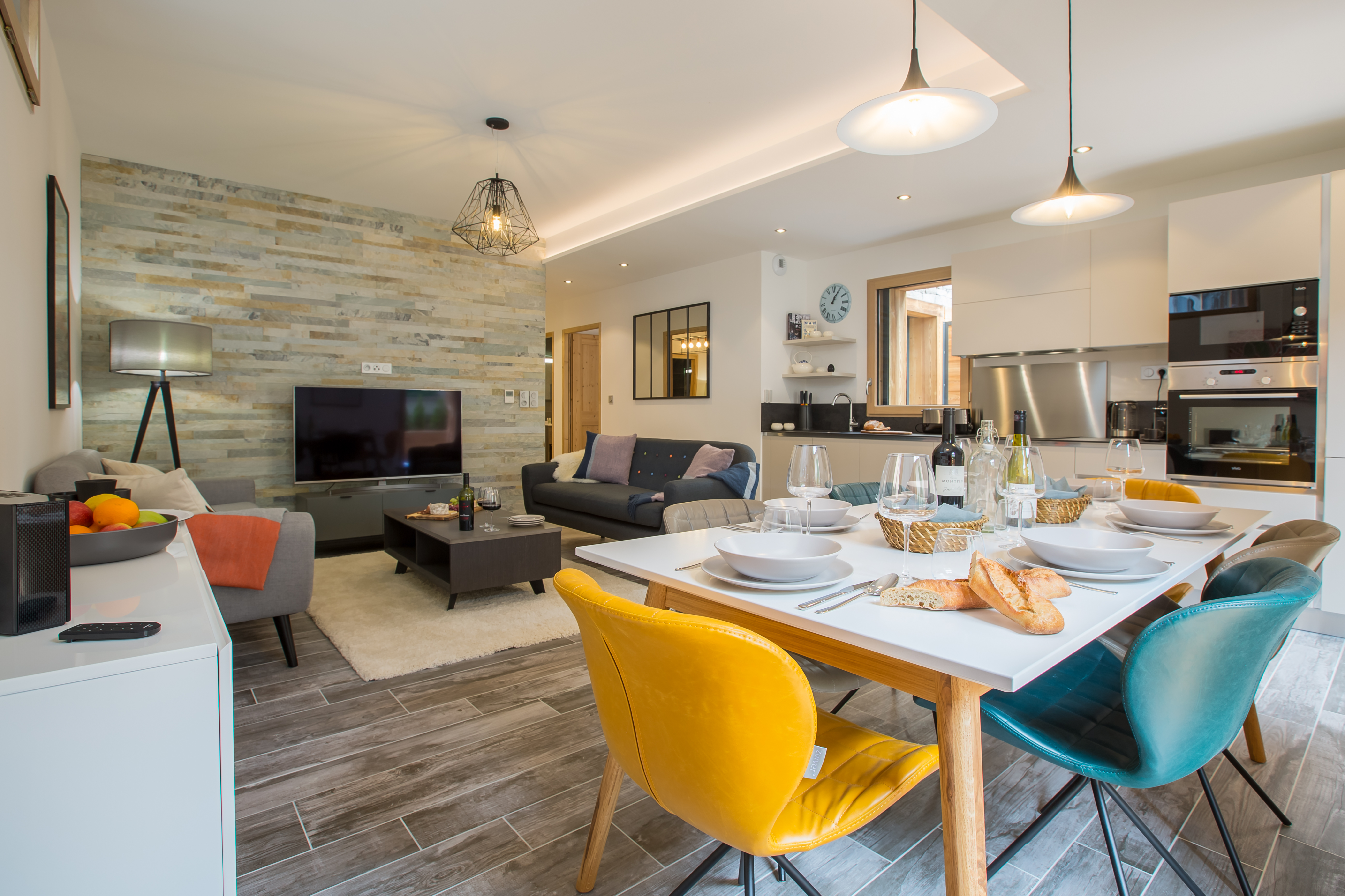 The open plan living area has a dining table that seats 6 people and a bespoke fitted kitchen with all mod cons including granite worktops, Nespresso Machine, dishwasher, fridge freezer, oven with induction hob,microwave, kettle, and toaster. There is a Bose Speaker and large flatscreen TV with UK Freesat and French TV, Netflix, PS4 Games Console and Free WiFi and a washing machine and tumble dryer
