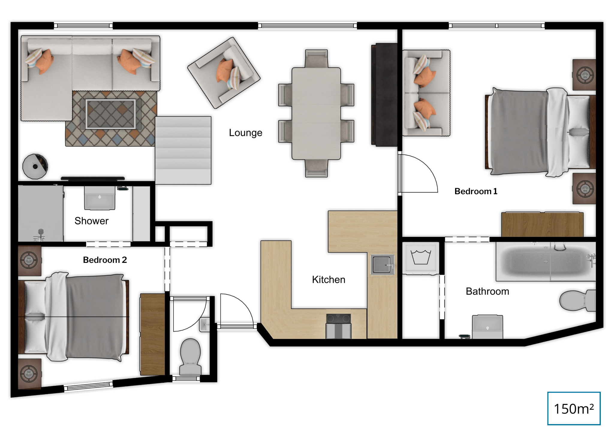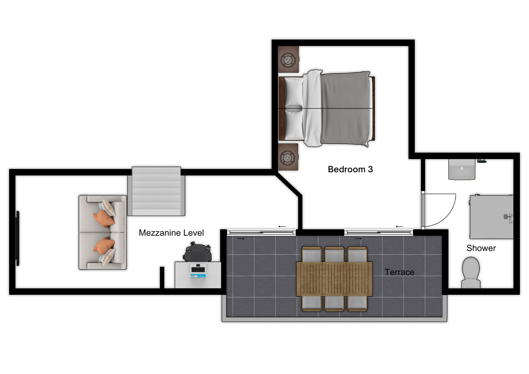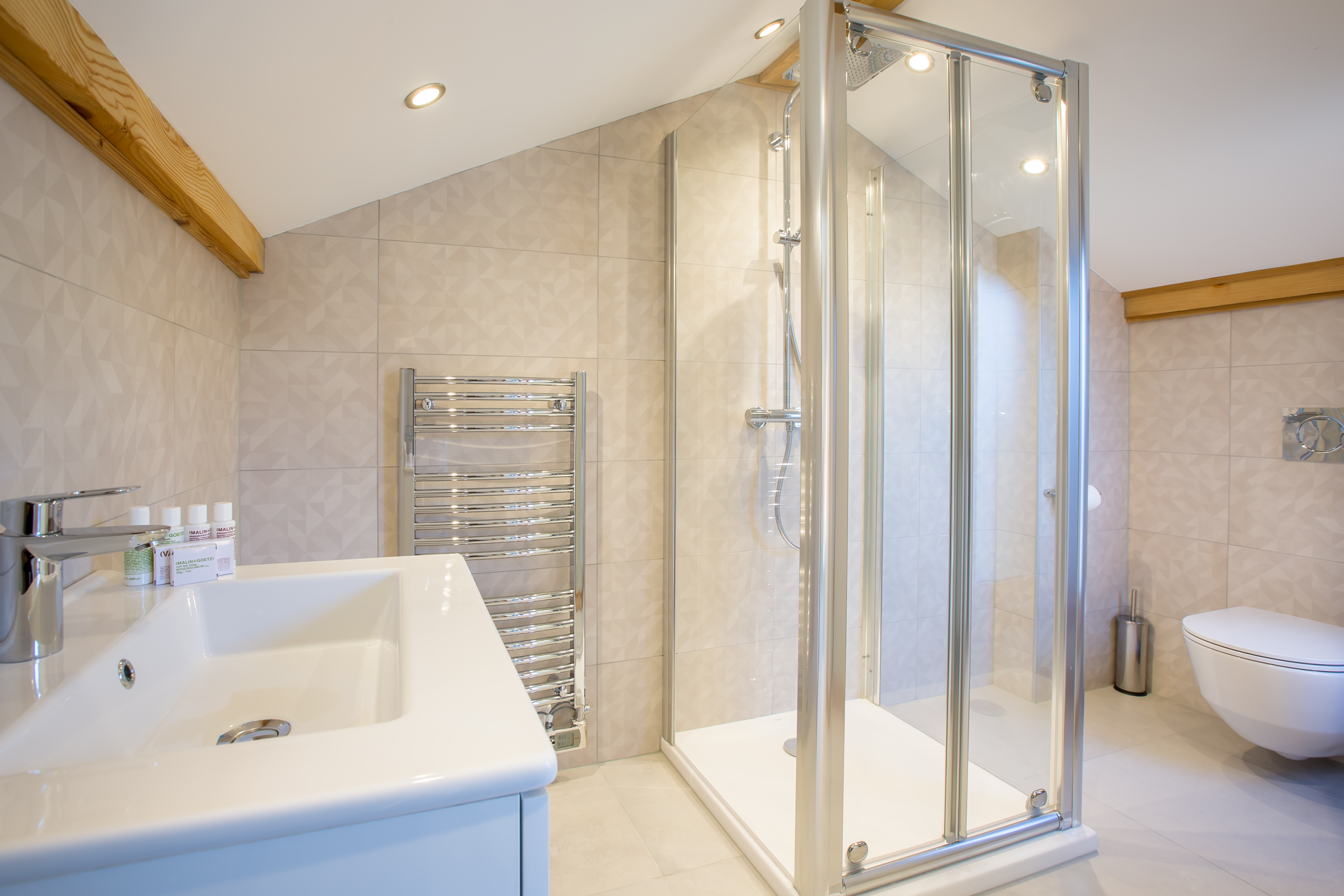 2 double ensuite bedrooms are at the entry level. The master has a super king bed, with a full size single trundle bed, balcony and ensuite bathroom with bath and overhead shower. The 2nd bedroom is a good size with an ensuite shower room and separate toilet and can be configured as a twin or double. Upstairs, the 3rd ensuite bedroom can be configured as a double or twin.