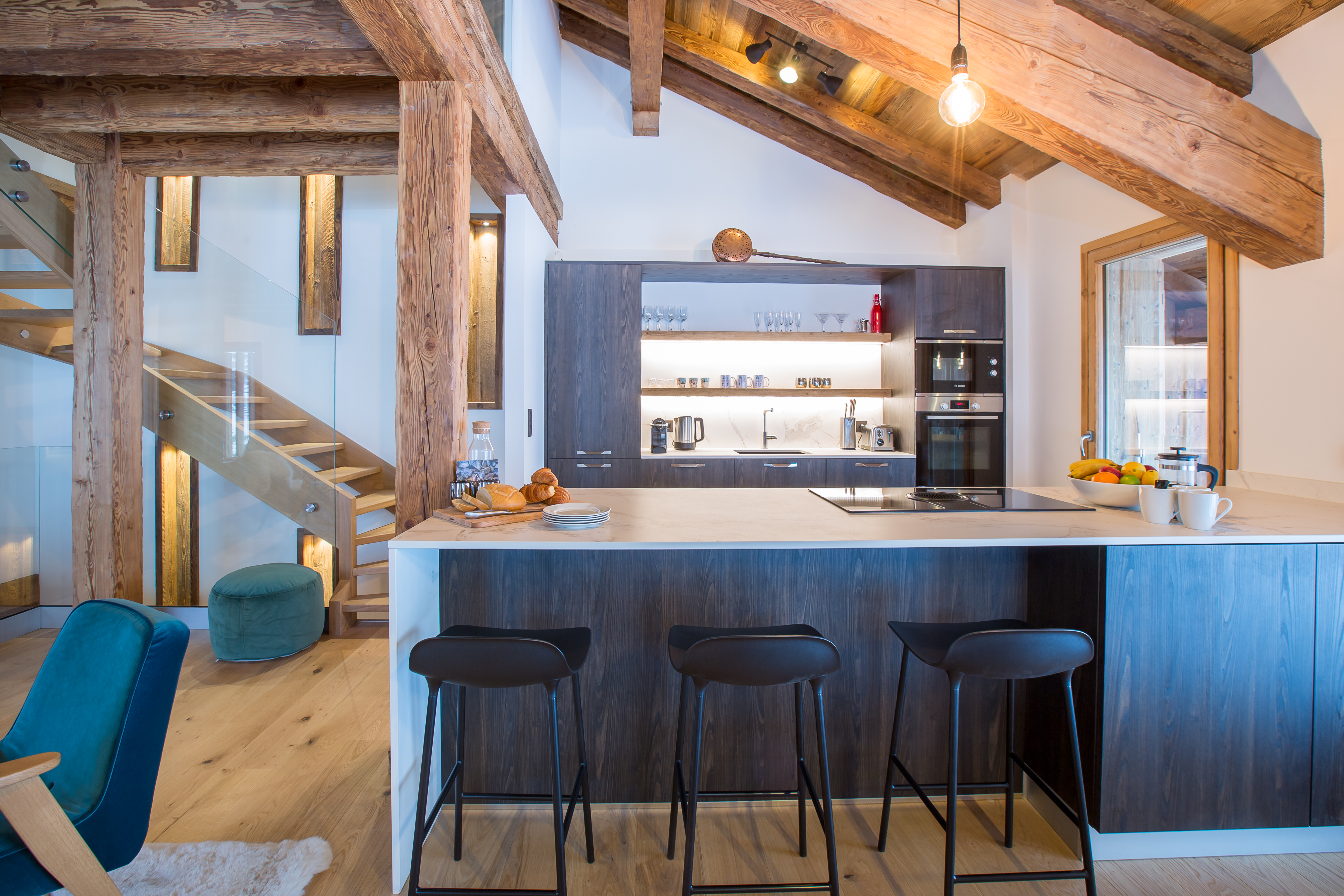 Upstairs to the first floor, there is a stunning and impressive open plan living space with a wood burning stove, vaulted ceilings and mountain views. The dining area comfortably seats 8/10 around an oak table and the kitchen comes fully equipped with a Nespresso Machine, dishwasher, integrated fridge freezer, oven, induction hob, microwave, kettle, toaster, and plenty of workspace.