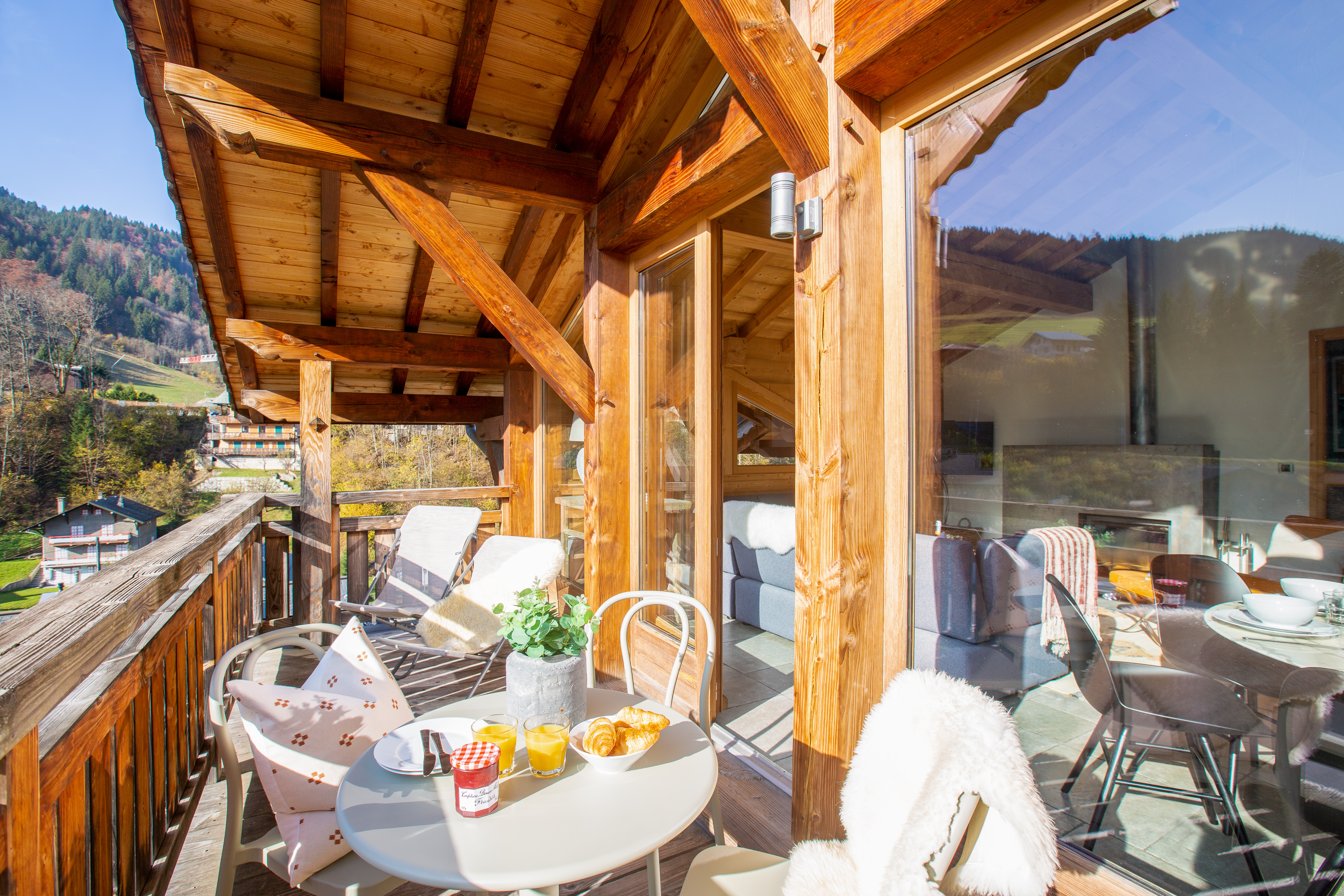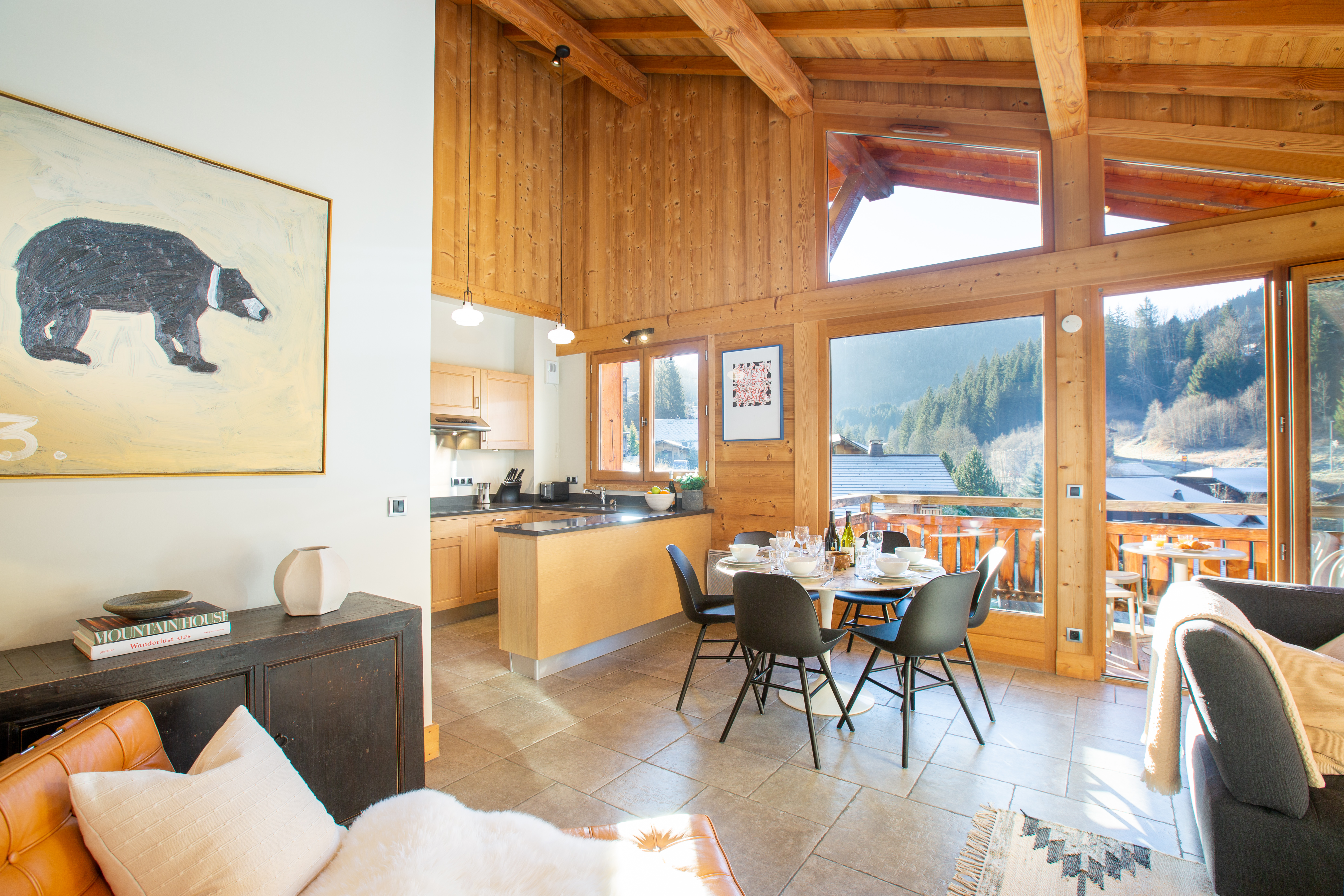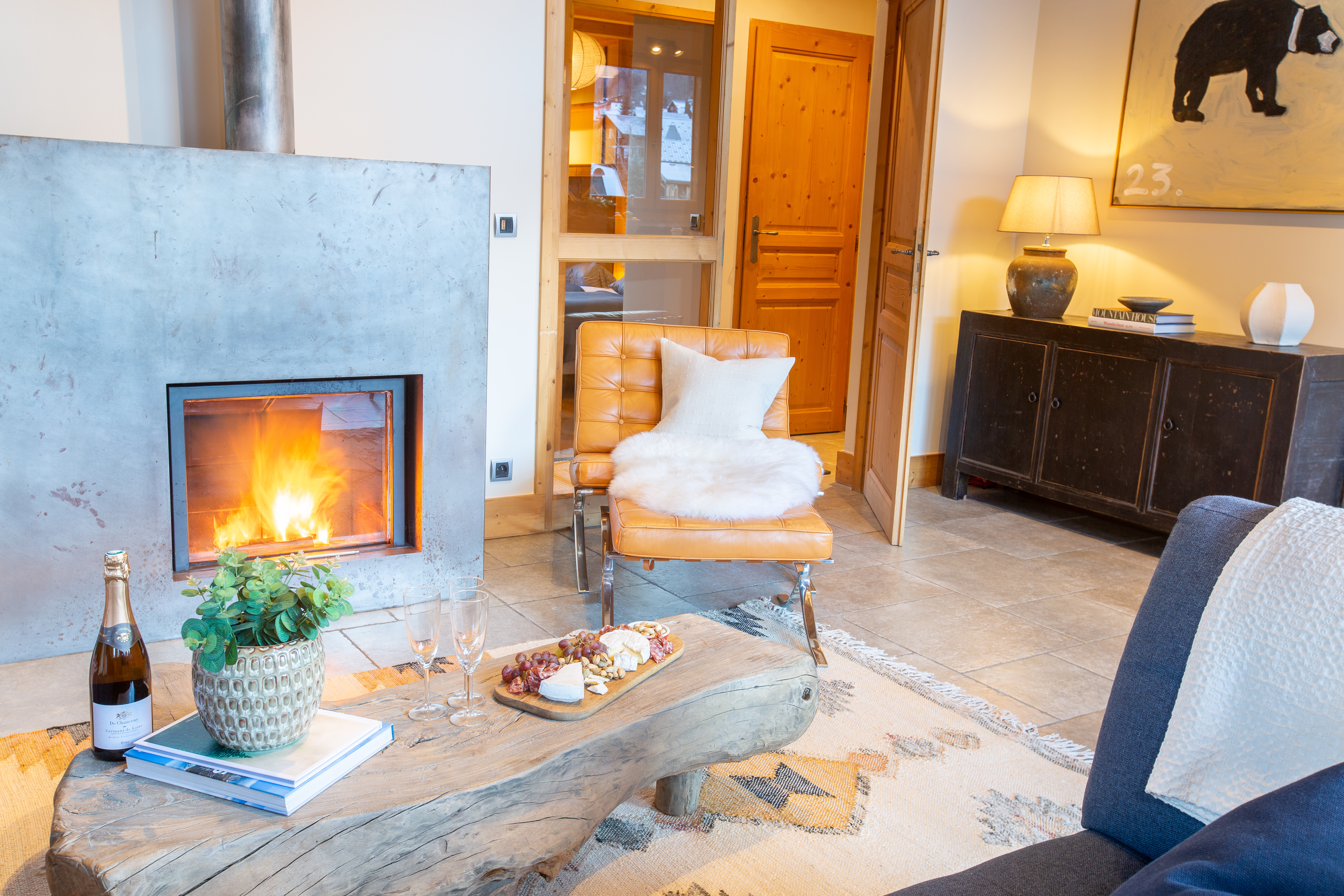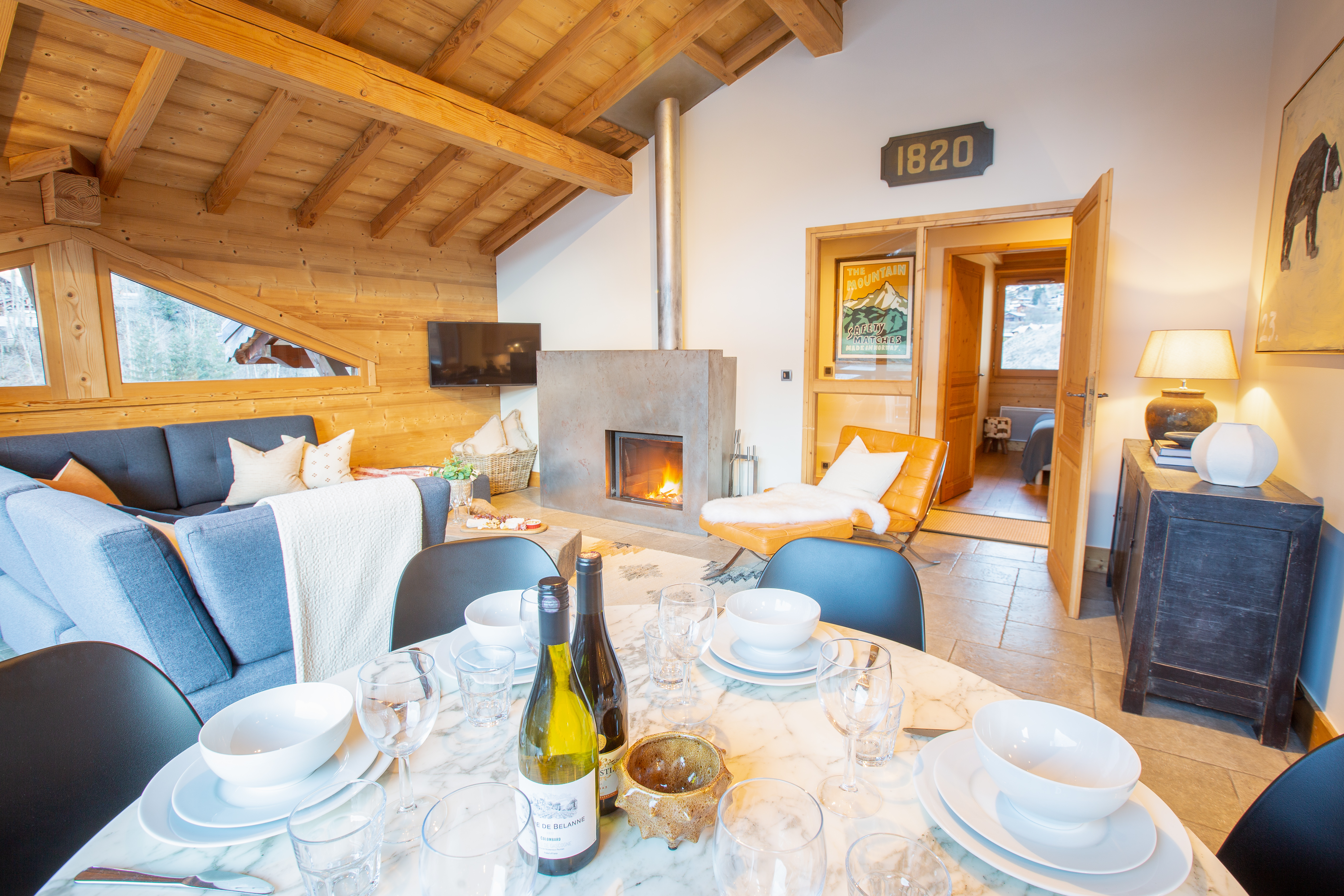 Penthouse Des Fes has a large living area, with timber vaulted ceilings and a Designer Log Burning Fireplace and plenty of comfy seats and a corner sofa. There is a large private balcony and the apartment has a Smart TV with UK and French TV channels, a Nintendo Wii and DVD player, a Bose SoundTouch wireless speaker, and Wifi.
