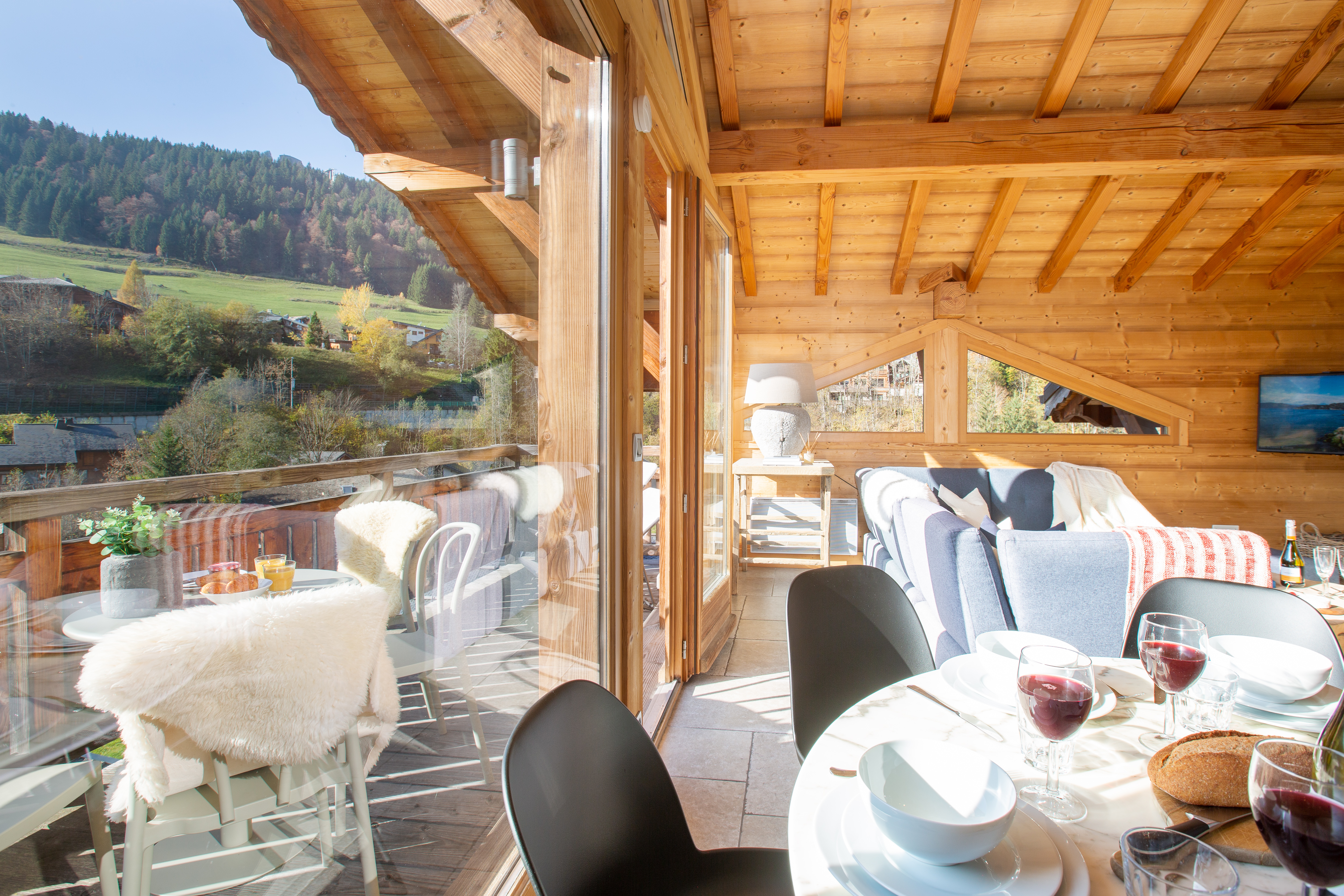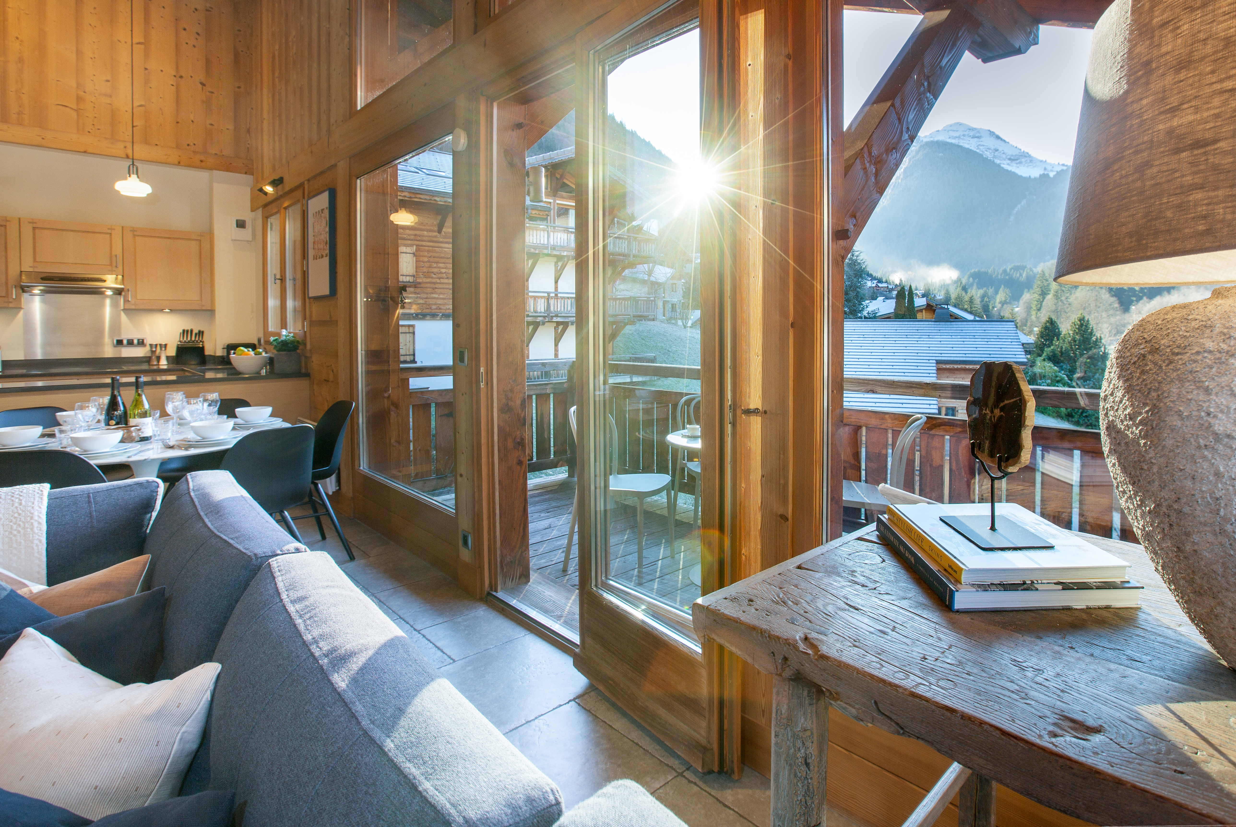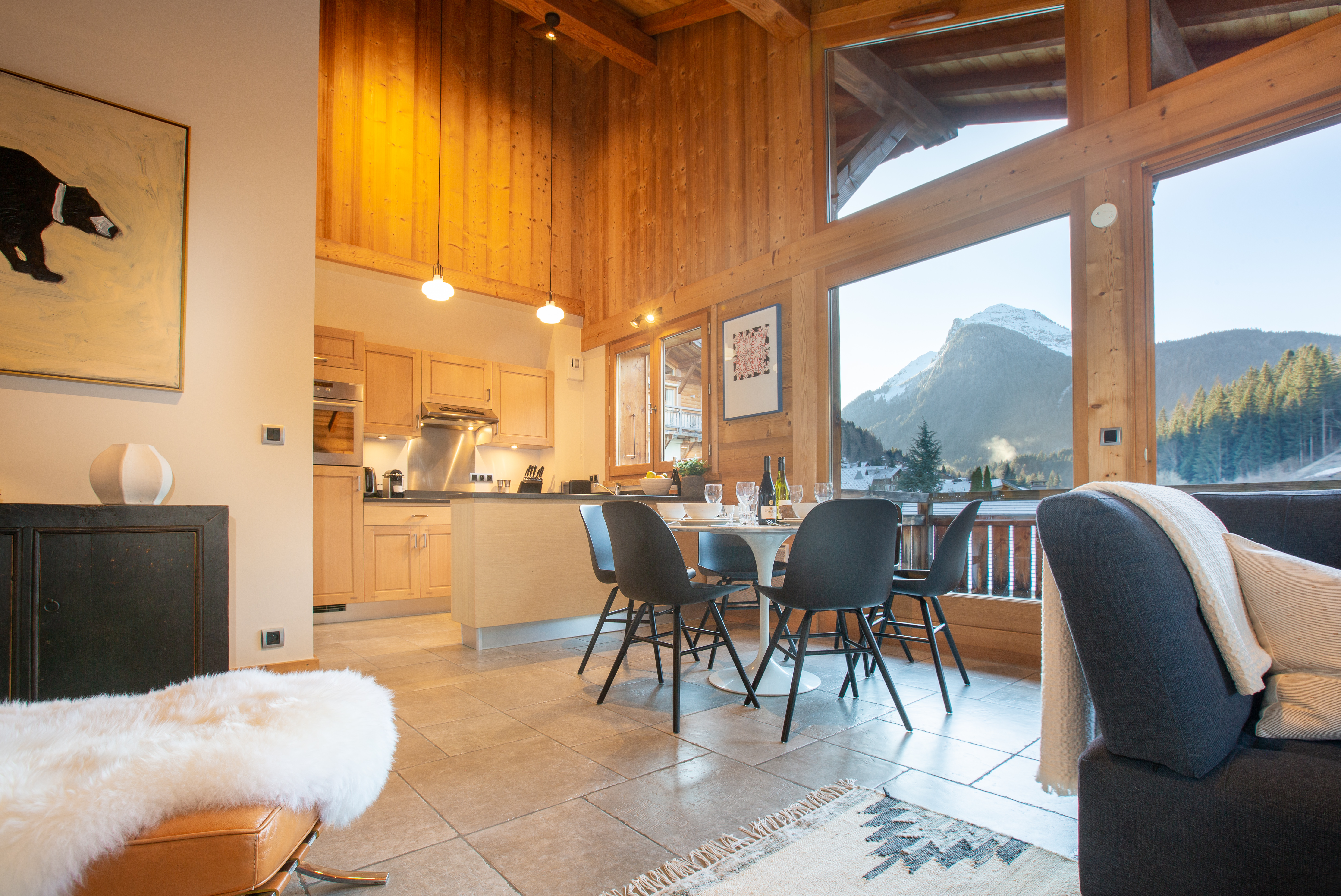 Penthouse Des Fes has a large living area, with timber vaulted ceilings and a Designer Log Burning Fireplace and plenty of comfy seats and a corner sofa. There is a large private balcony and the apartment has a Smart TV with UK and French TV channels, a Nintendo Wii and DVD player, a Bose SoundTouch wireless speaker, and Wifi.