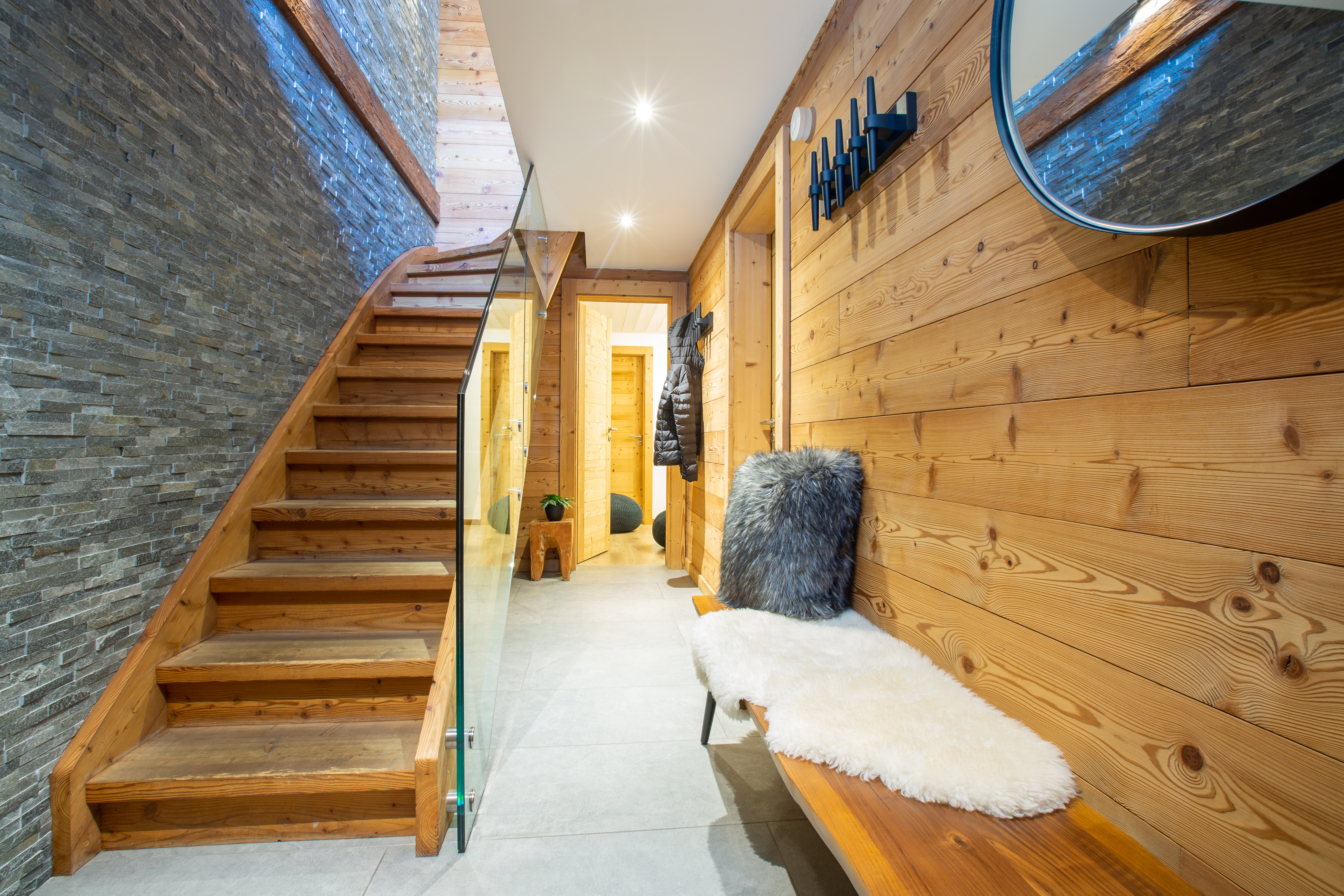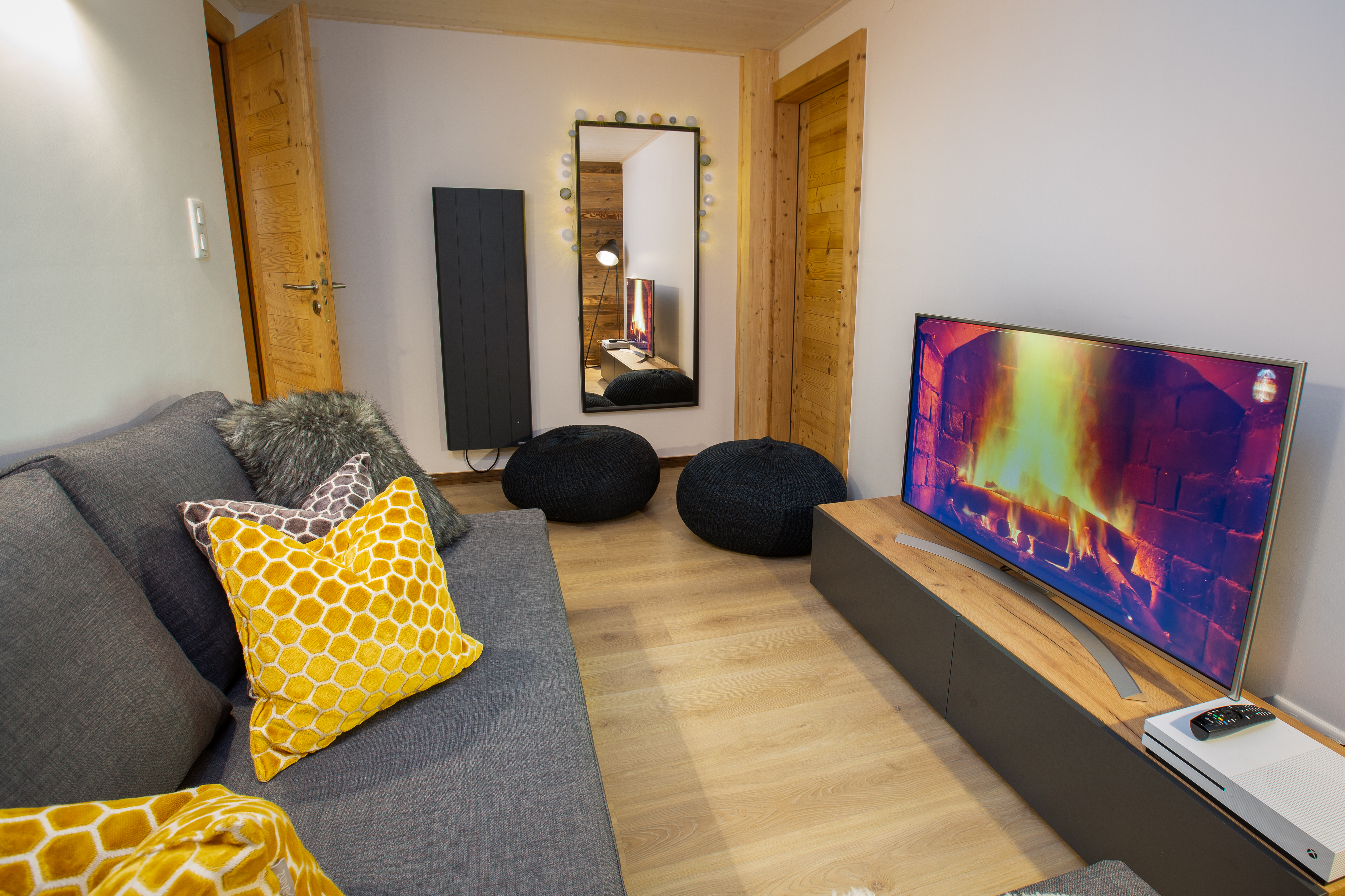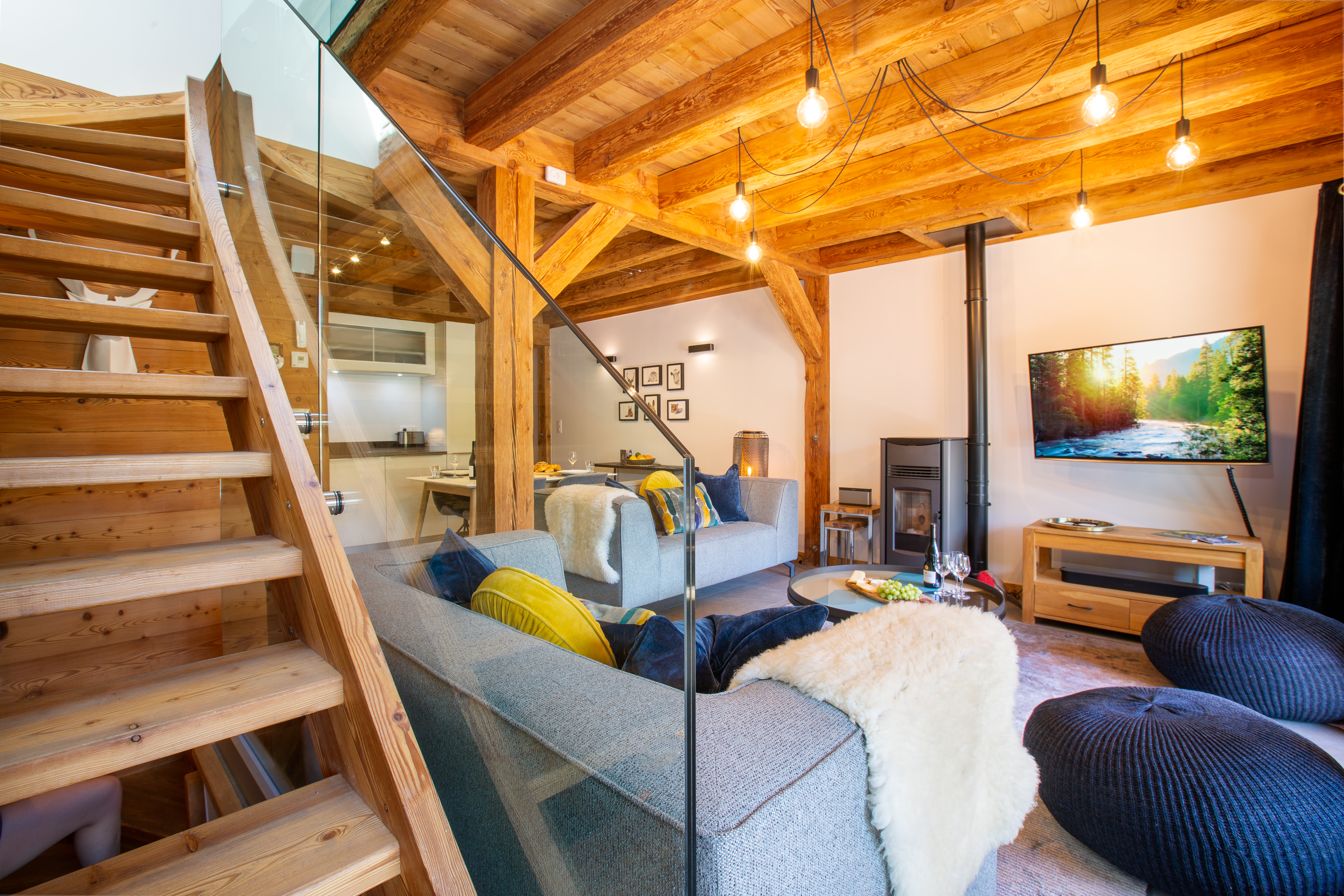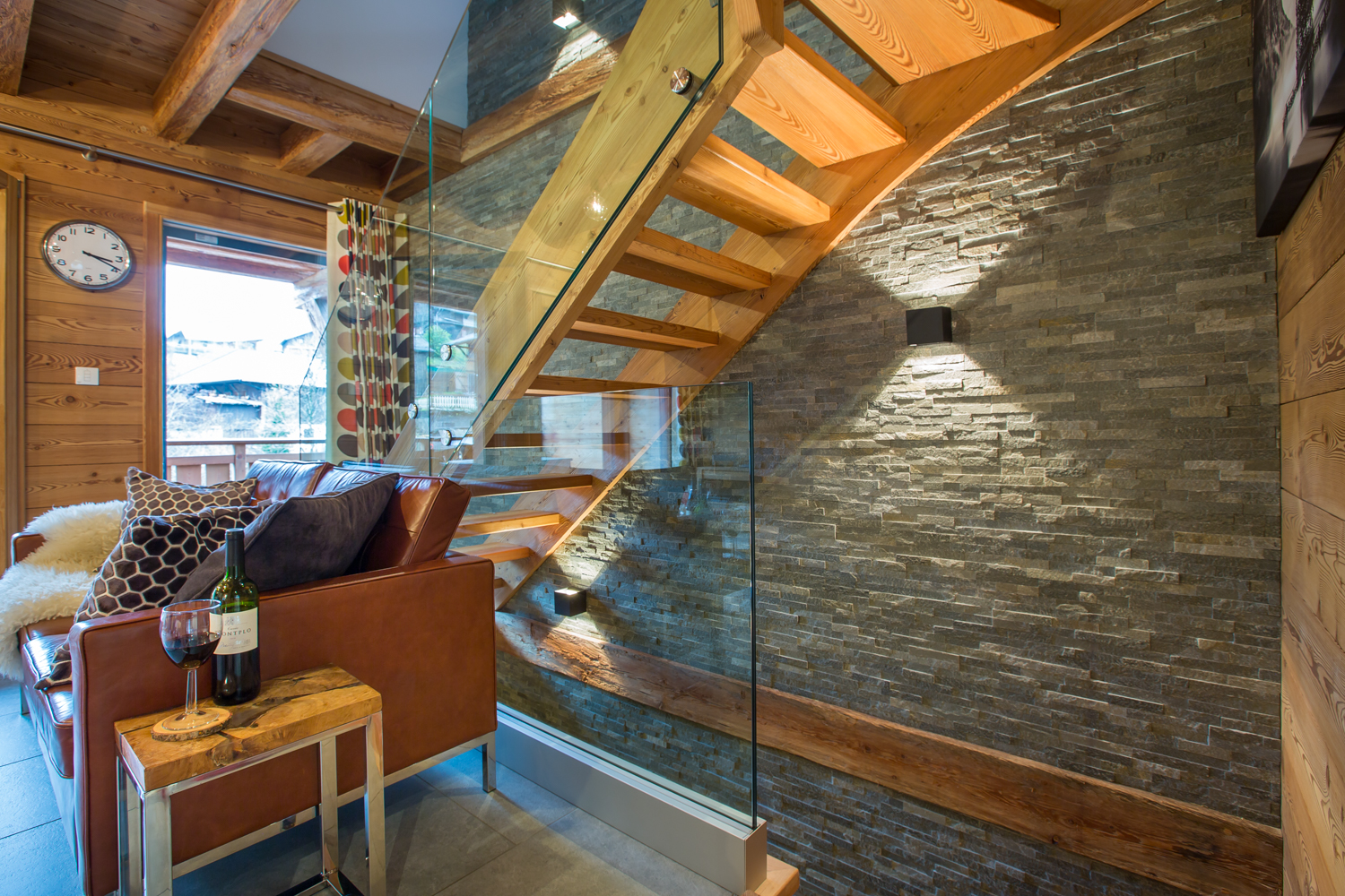 Built over three levels, this semi detached chalet sleeps 6 people very comfortably in 3 bedrooms, with 2.5 bathrooms. It is on 3 levels and has a stylish open plan living space with full height slate wall, glass balustraded staircase and x-large south facing balcony with mountain views with a perfectly positioned private Jacuzzi.