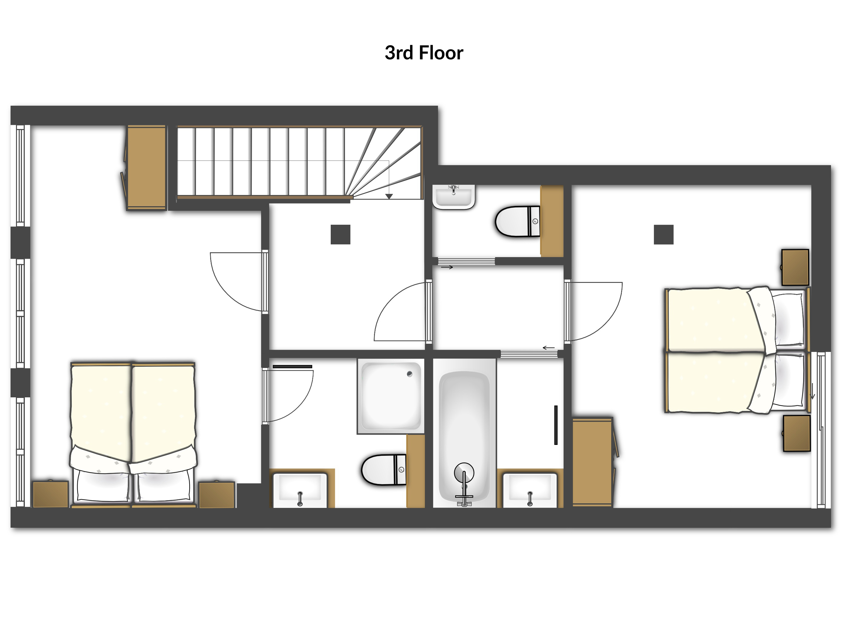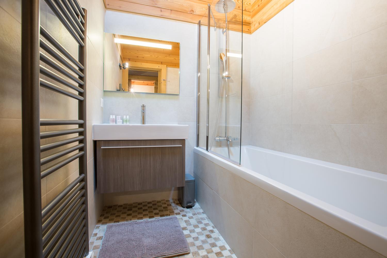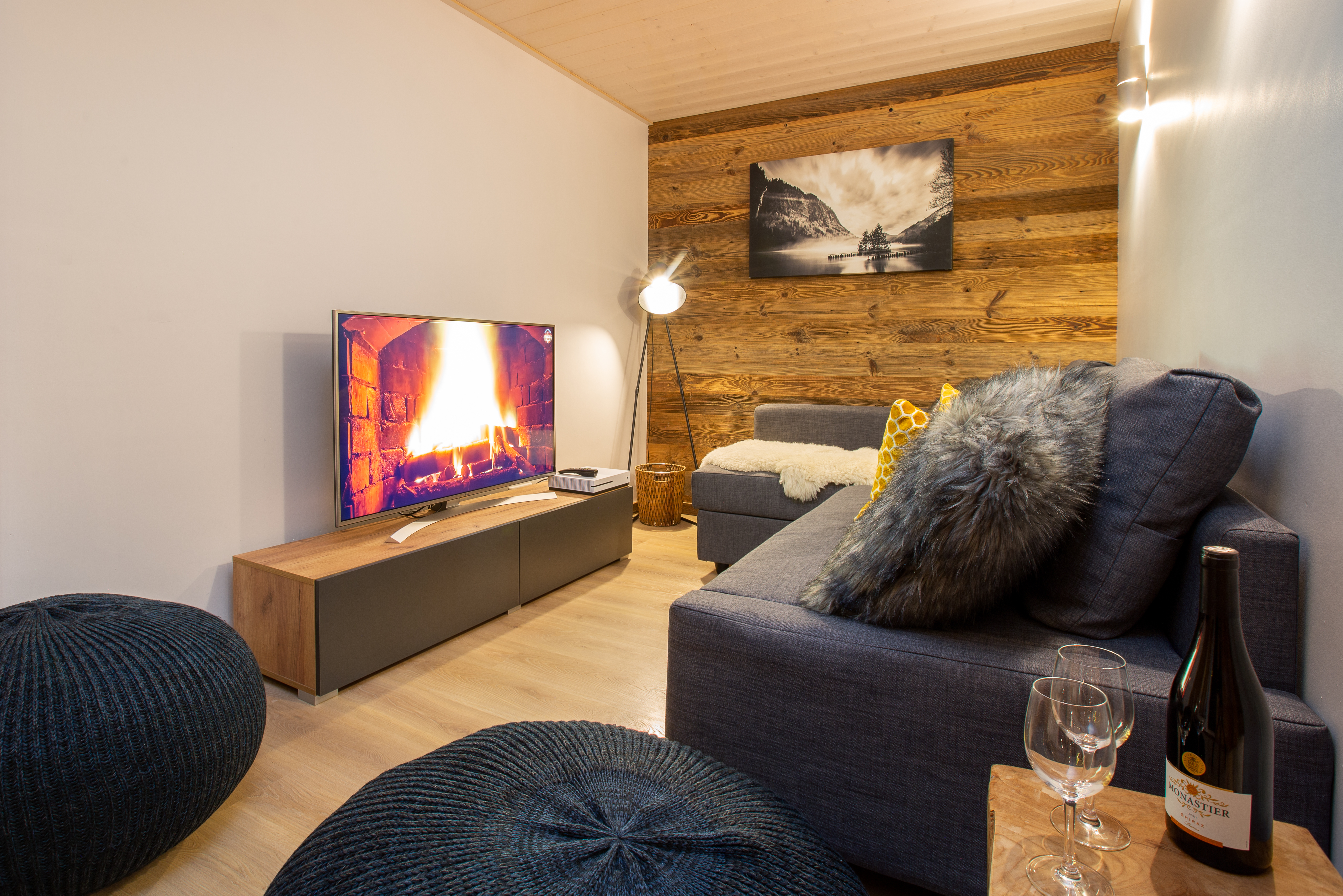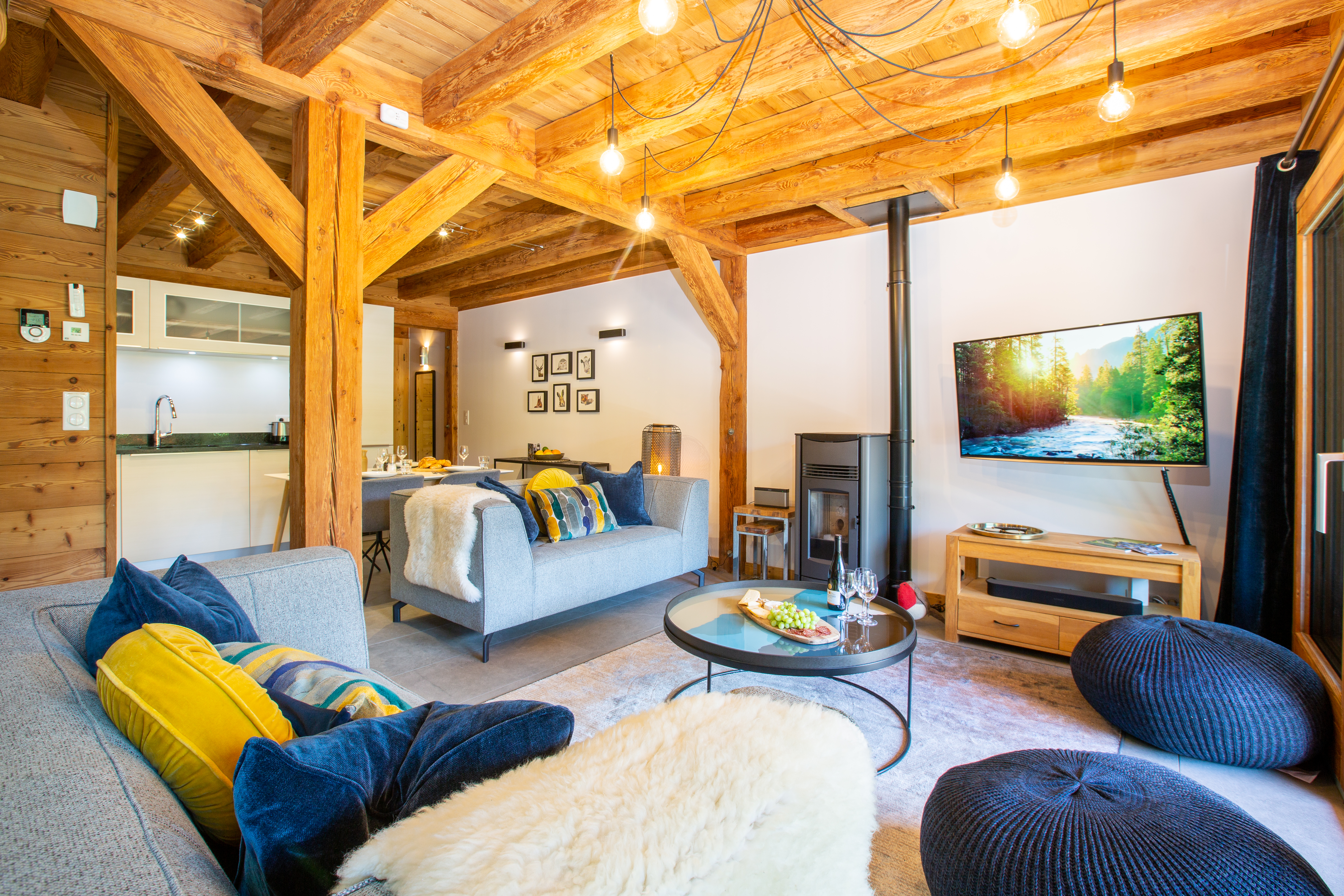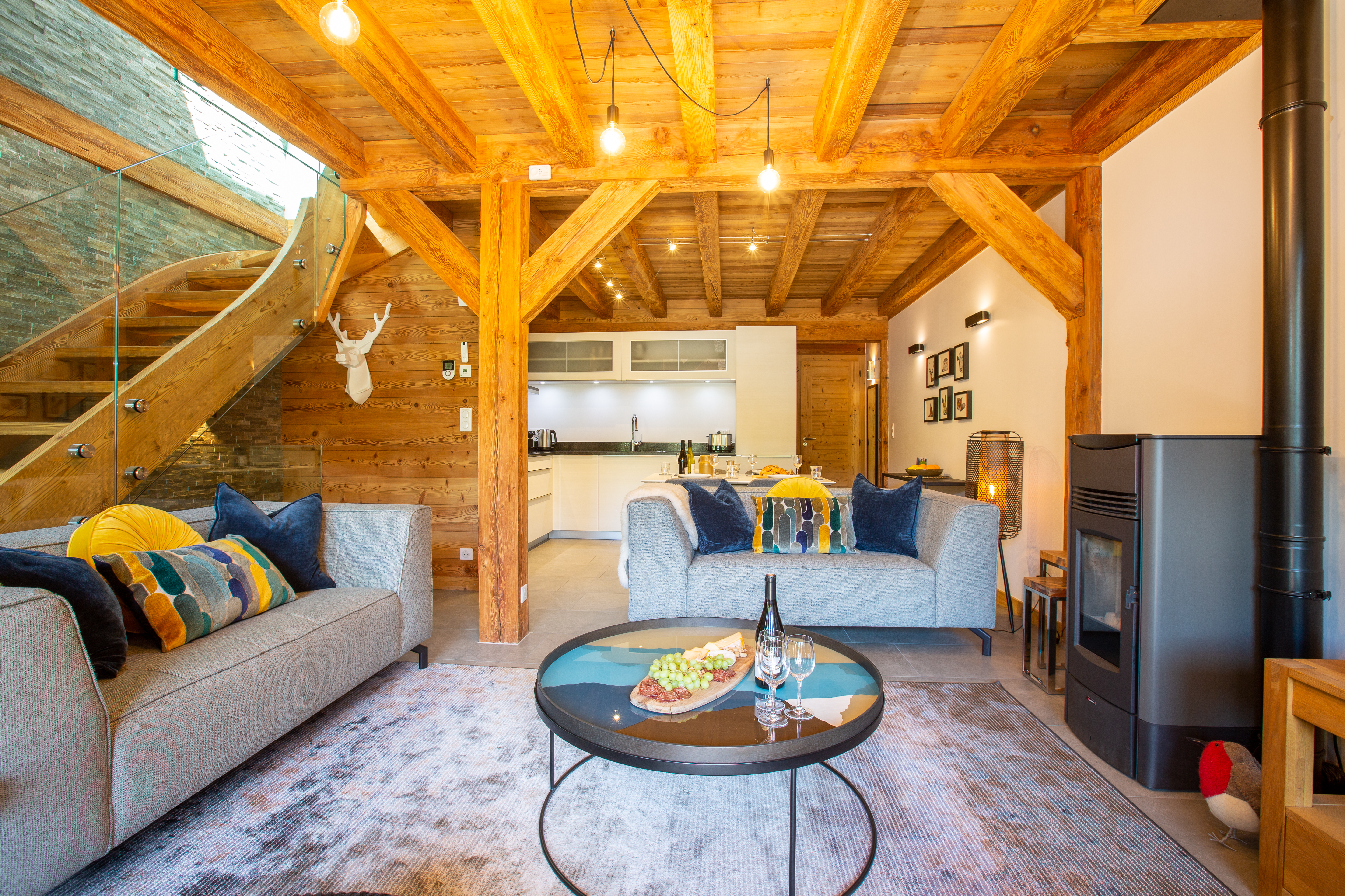 Built over three levels, this semi detached chalet sleeps 6 people very comfortably in 3 bedrooms, with 2.5 bathrooms. It is on 3 levels and has a stylish open plan living space with full height slate wall, glass balustraded staircase and x-large south facing balcony with mountain views with a perfectly positioned private Jacuzzi.