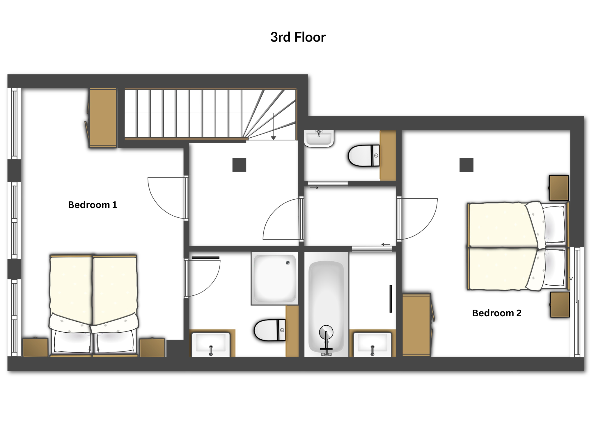 There are 3 bedrooms, the two largest being on the top floor. The master suite is spacious and has a well designed jack and jill style bathroom with seperate WC, Duravit bath with oversized rain shower and designer sink unit.