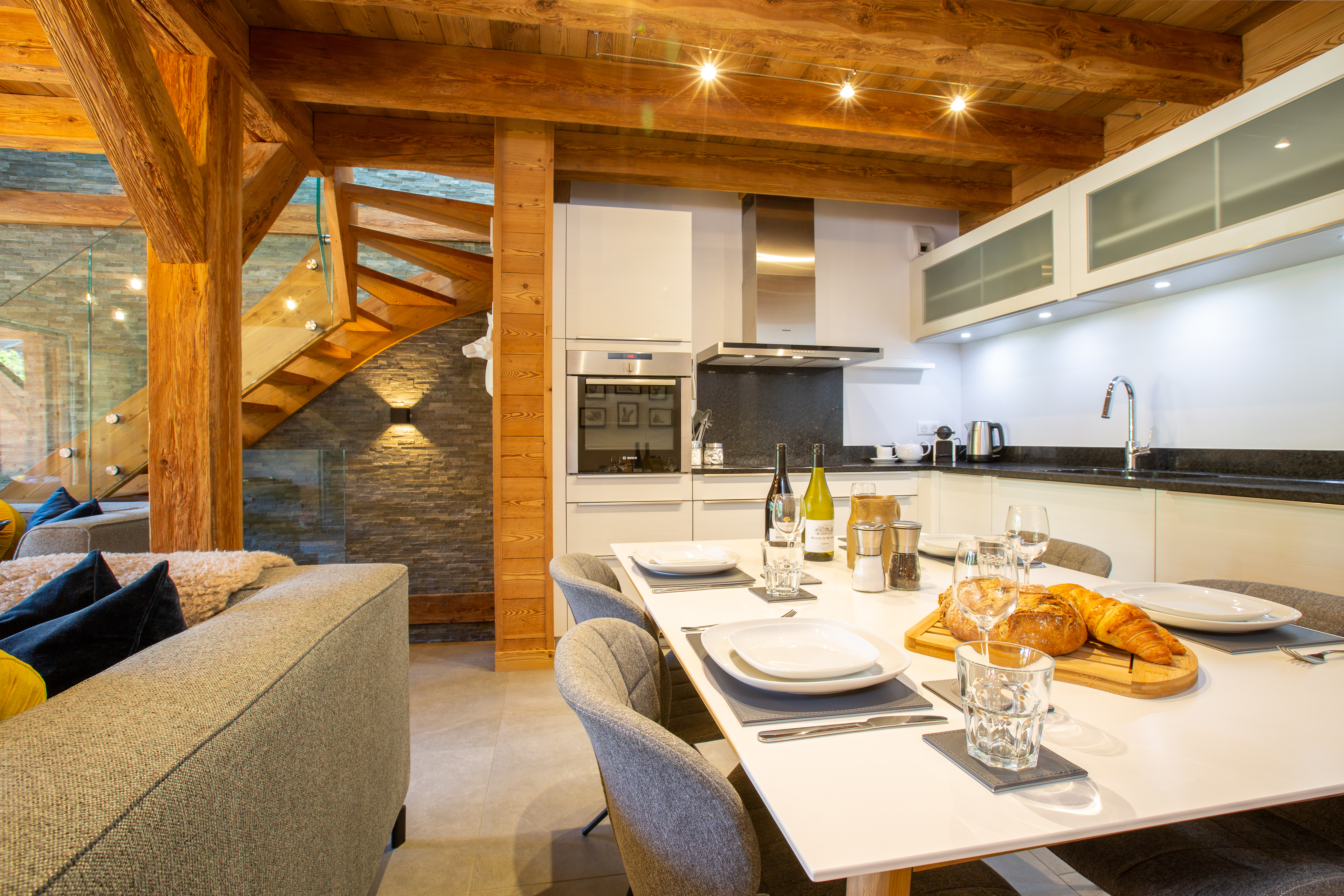 The lounge features an eco friendly wood pellet stove, Bose Speaker and large flatscreen TV with UK and French TV channels, and Free WiFi. The modern kitchen is well equipped with a Nespresso Machine, dishwasher, integrated fridge freezer, oven with induction hob, kettle, and toaster. There is a large south facing balcony off the lounge with a table for outdoor dining, Weber BBQ in summer and outdoor hot tub.