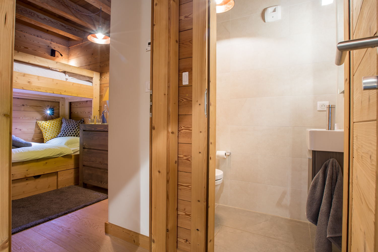 The second bedroom is also a good size and features a south facing balcony with stunning views of the Nyon and Pleney mountains. Again ensuite with a wet room style walk in rain shower with Duravit fixtures and fittings. The additional bunk room is larger than average on the middle floor and has access to a seperate WC and sink and also has use of the master jack & jill bathroom upstairs.