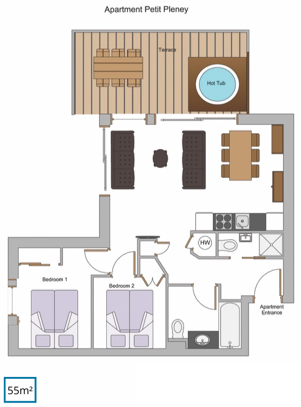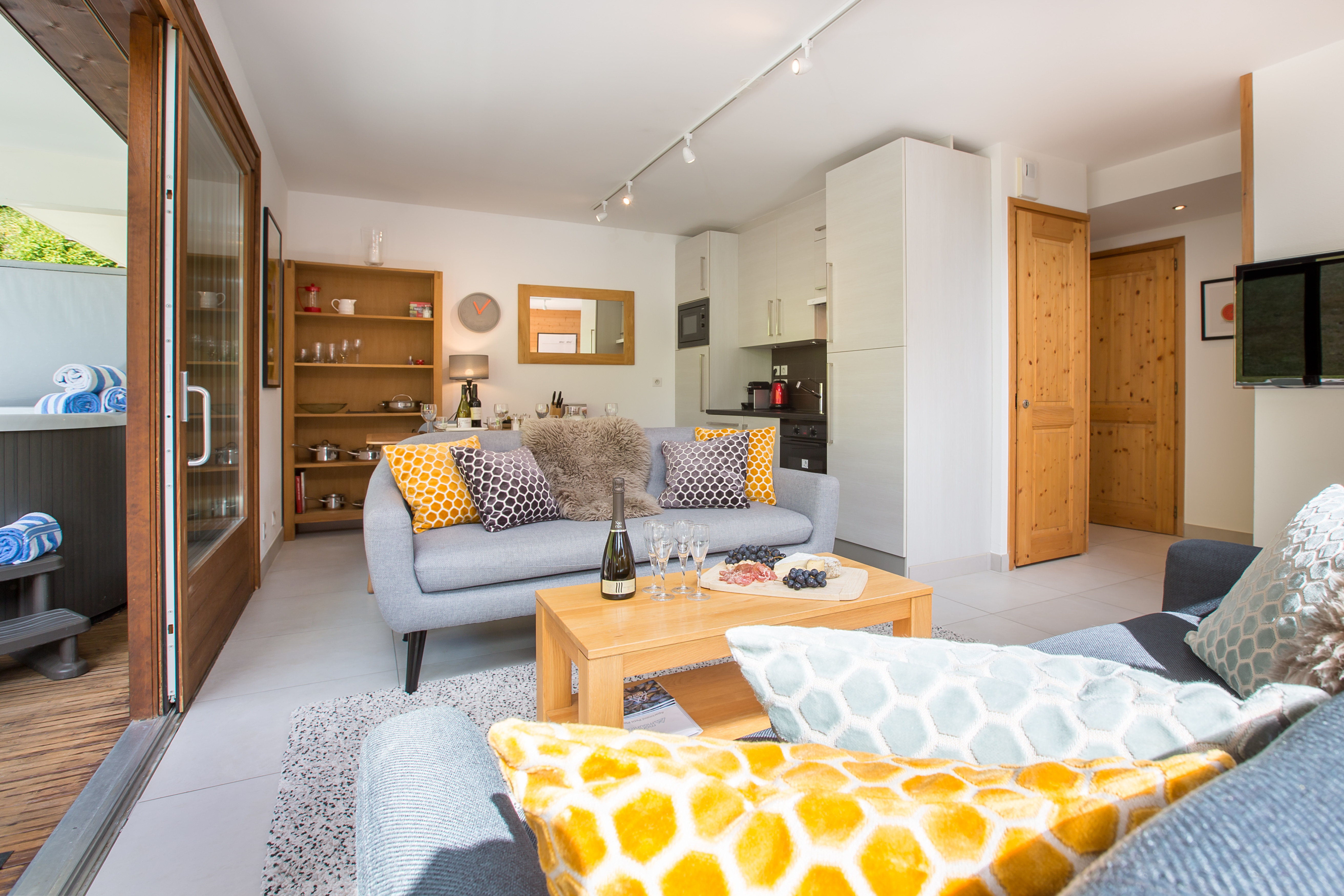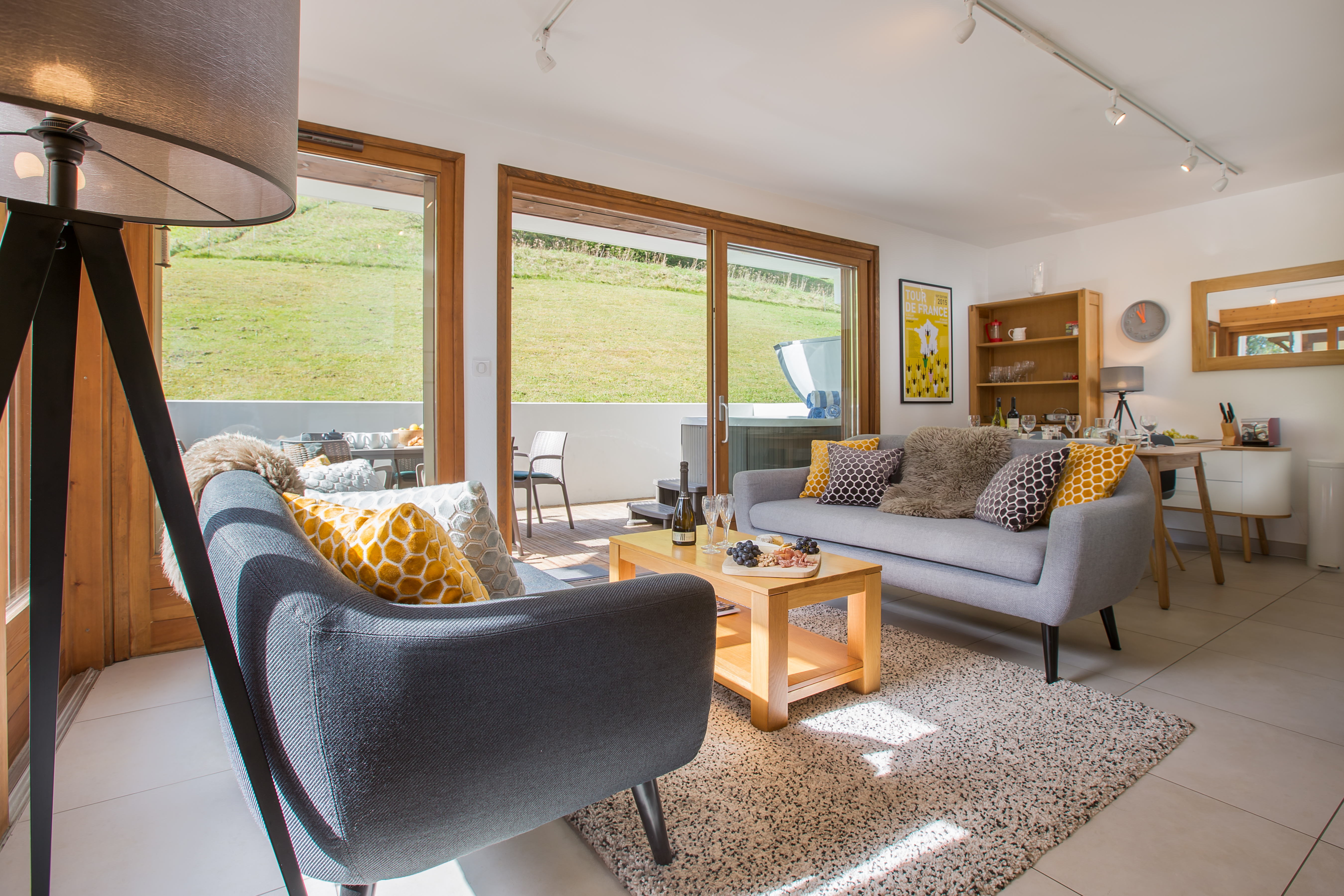 Fantastic ski in position on the Pleney with HOT TUB and large dining terrace facing the slopes. Stylish 2 bedroom, 2 bathroom apartment which sleeps 4 people very comfortably and benefits from modern open plan living and dining with views of the slopes.