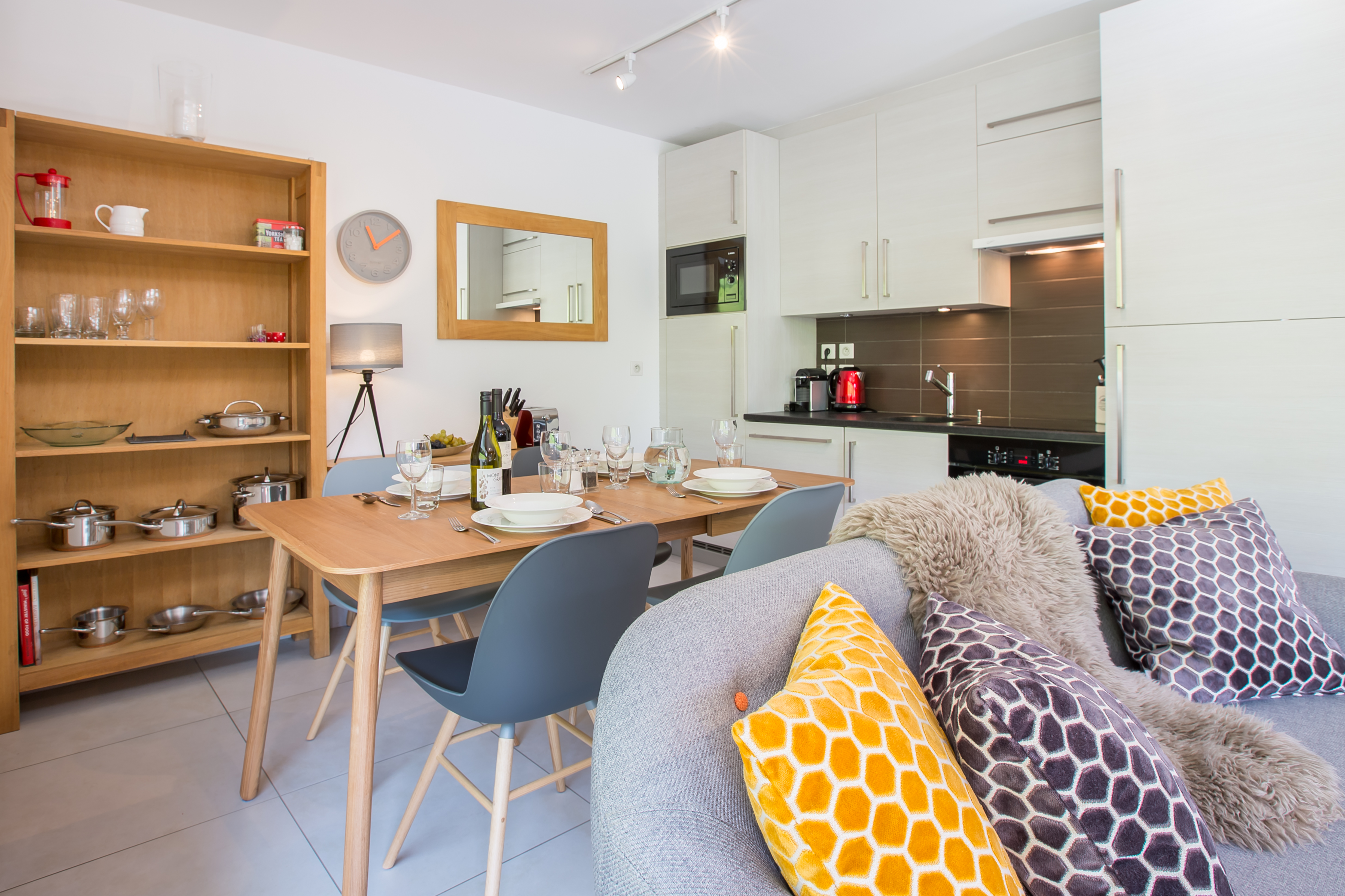 Bright open plan lounge area with 2 sofas, wall mounted flatscreen TV, Games Console, Apple TV, and Free Wifi. Plenty of space for 4 people with storage throughout. We have UK and French TV channels, a Bose Sound Dock, and Apple TV.