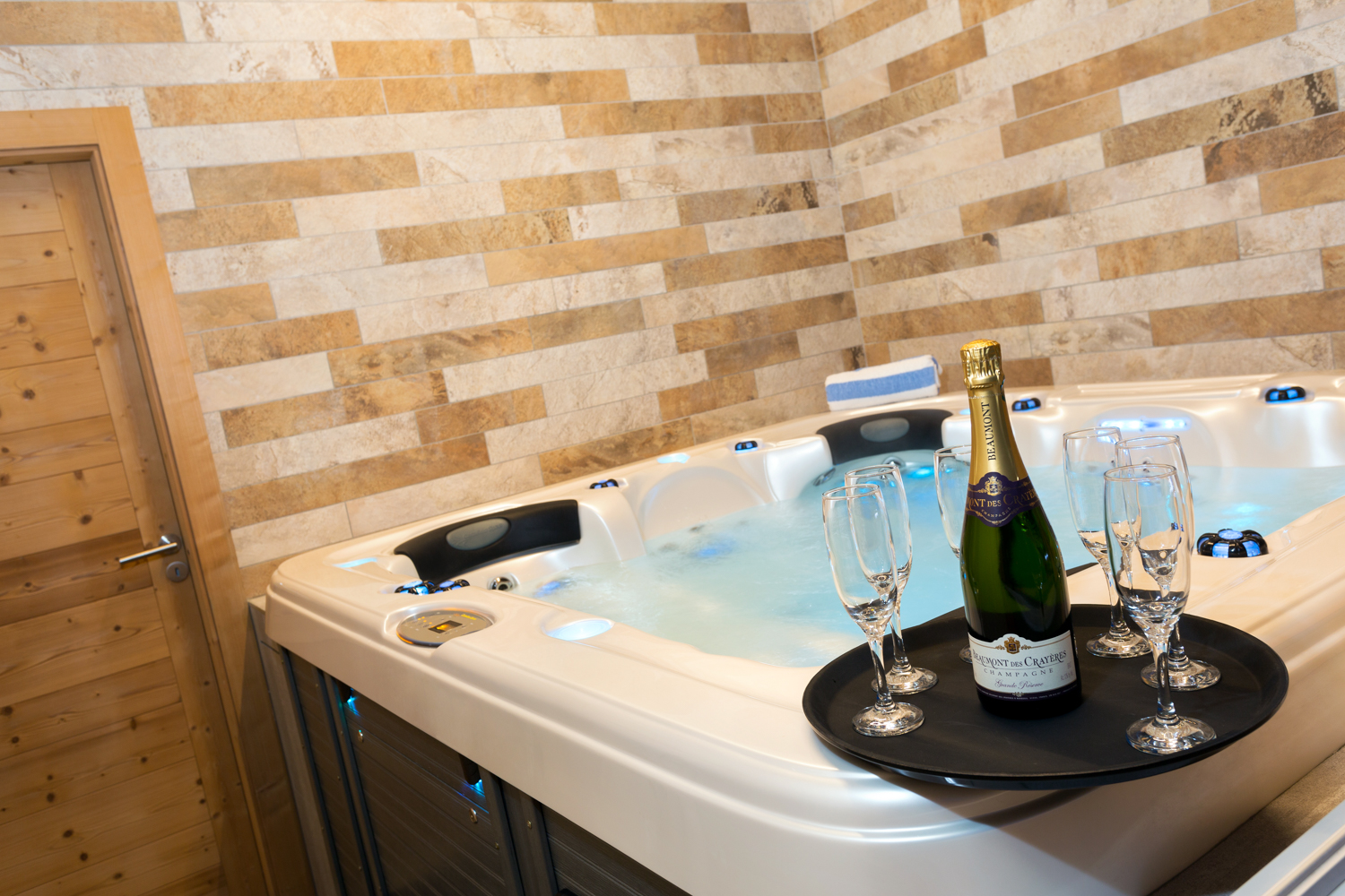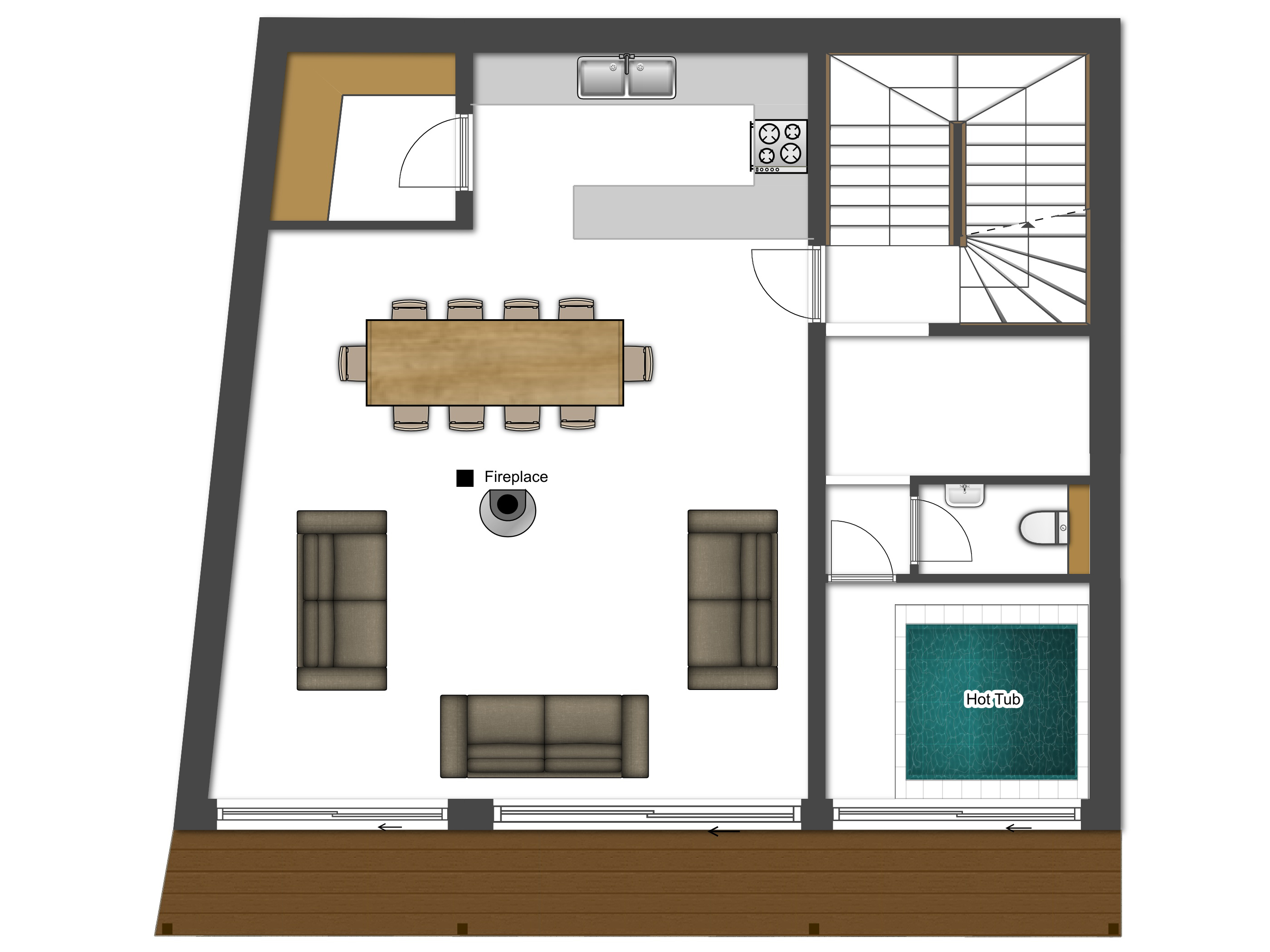 Enter the chalet into the open plan lounge, kitchen and dining space, with vaulted ceilings, log fire and large balcony. There is also a hot tub room with large window access onto the balcony.
