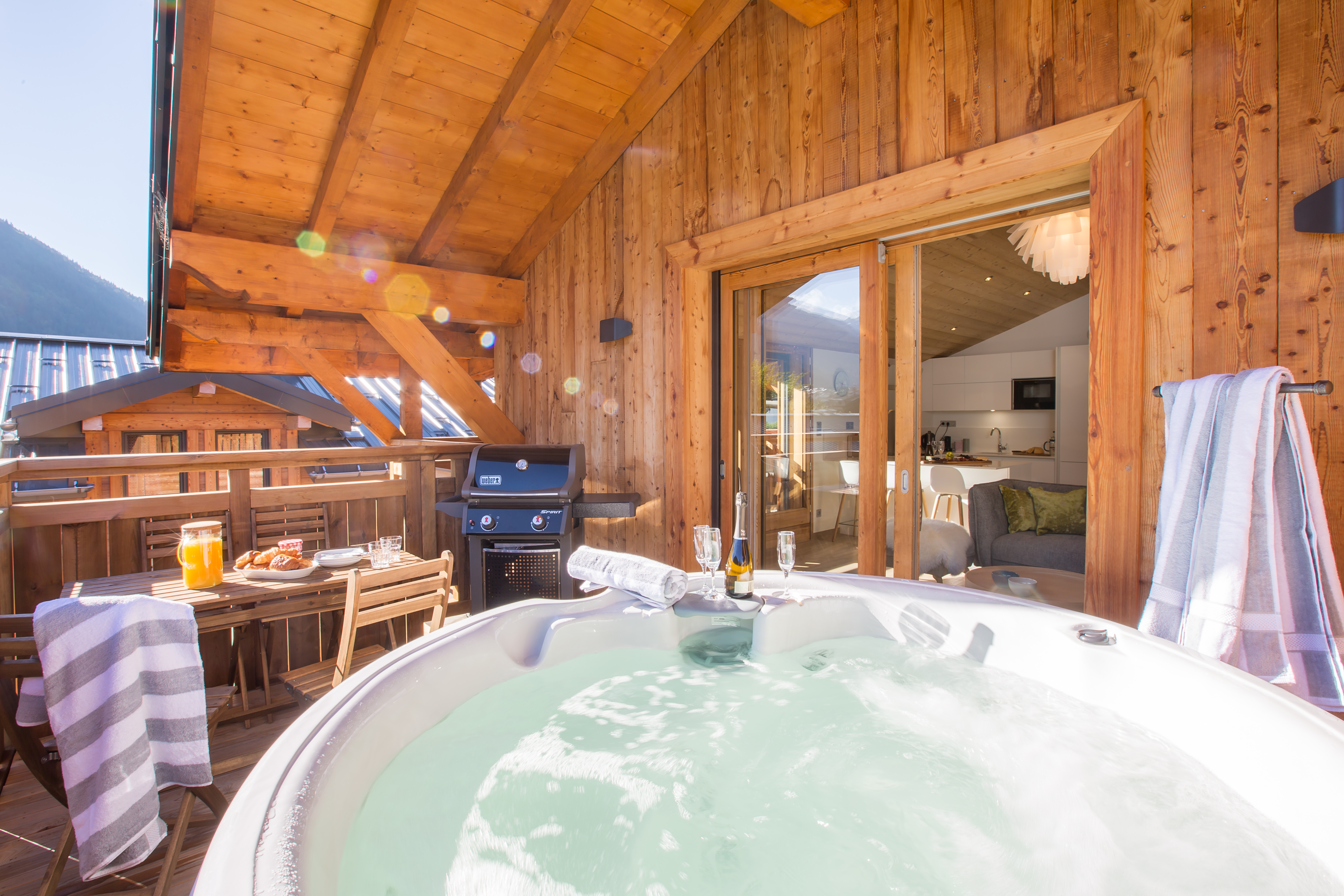 The open plan space is triple aspect with Scandinavian style furniture. Patio doors in the main living area open out onto a large balcony with outdoor hot tub and the open plan kitchen has all mod cons. There is an XL flat screen Smart TV with Netflix and UK and French TV channels, Bose Speaker, and Games Console.