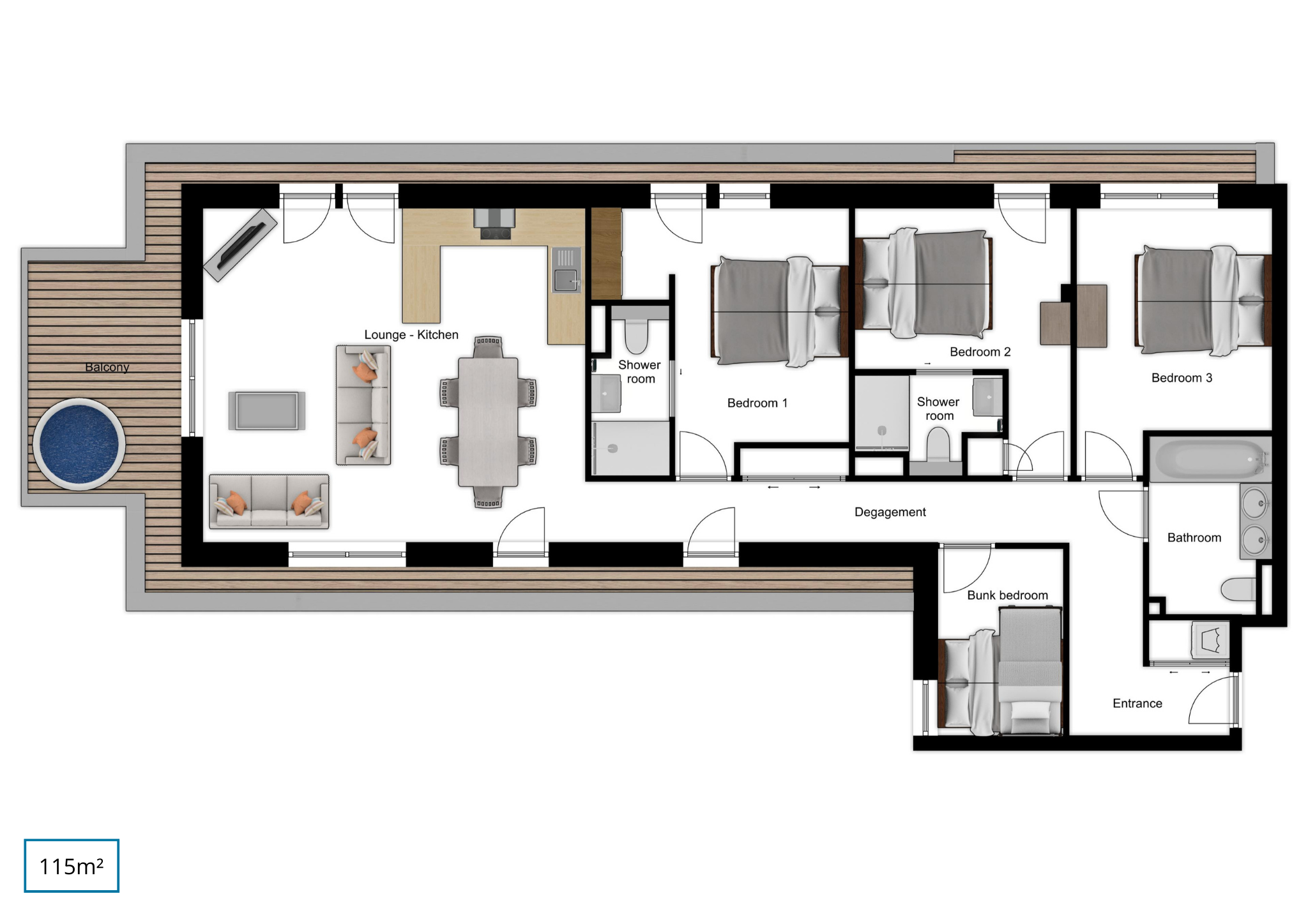 Large & Spacious Penthouse apartment with Balcony HOT TUB, in a prime position, directly opposite the Pleney Telecabine and nursery slopes. Sleeping up to 9 people in 3 Large double bedrooms with an additional double bunk room, open living space with outdoor Hot Tub on the balcony with mountain views.