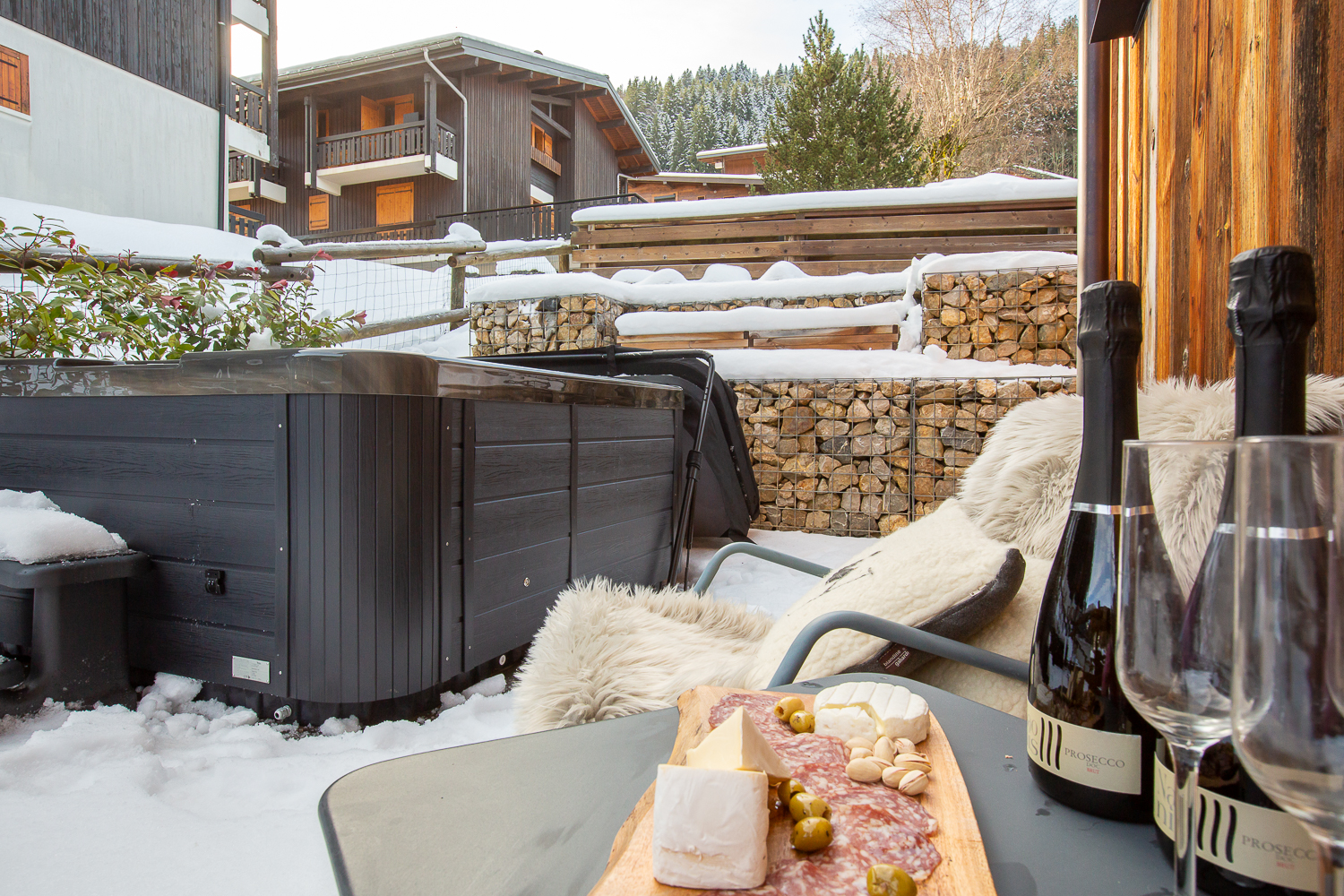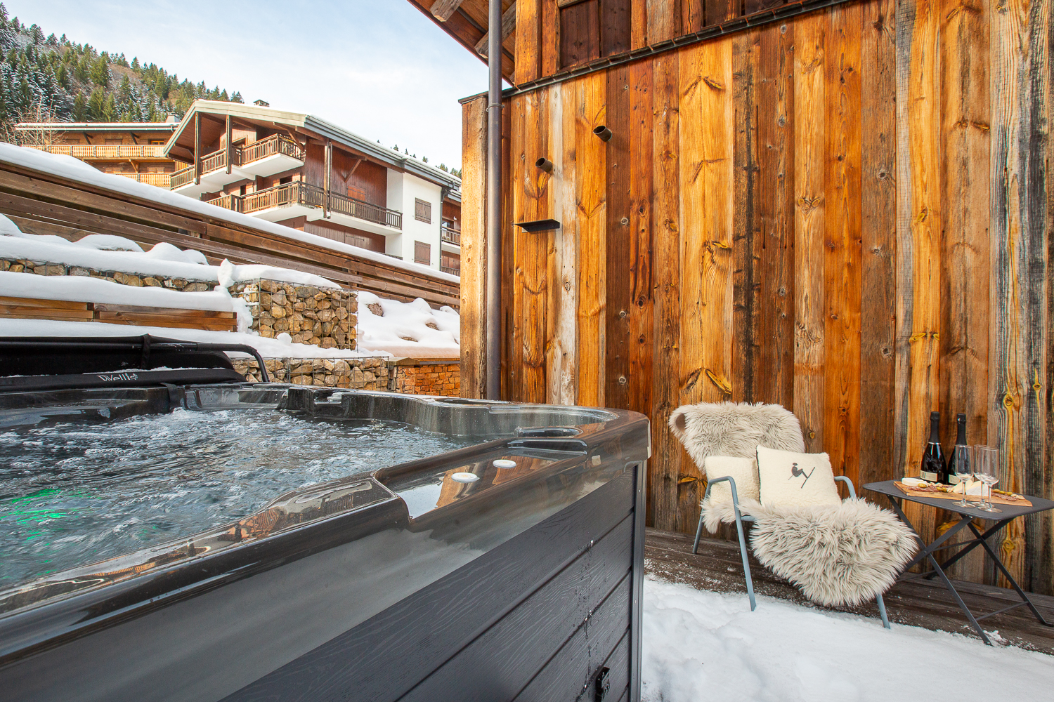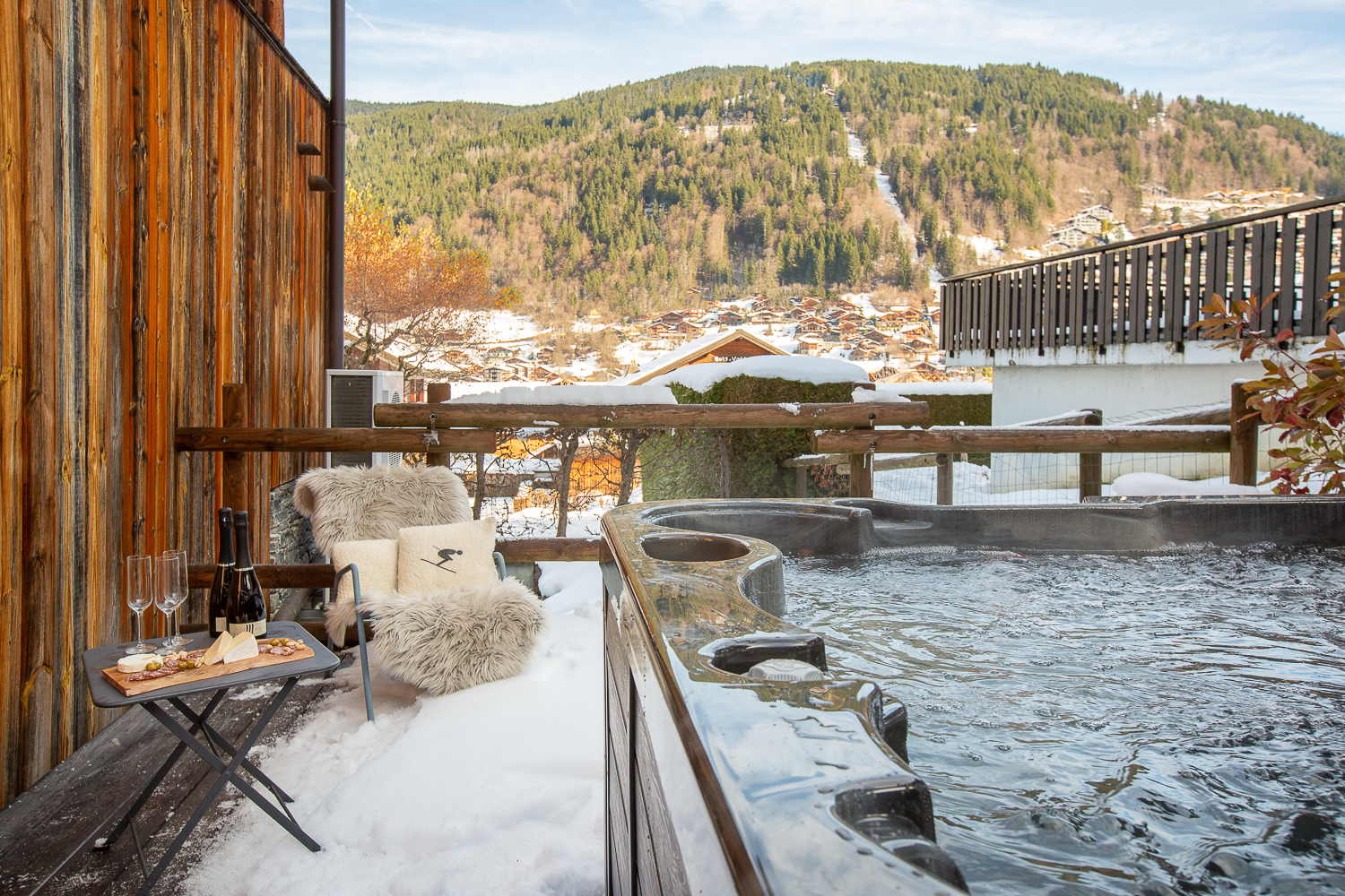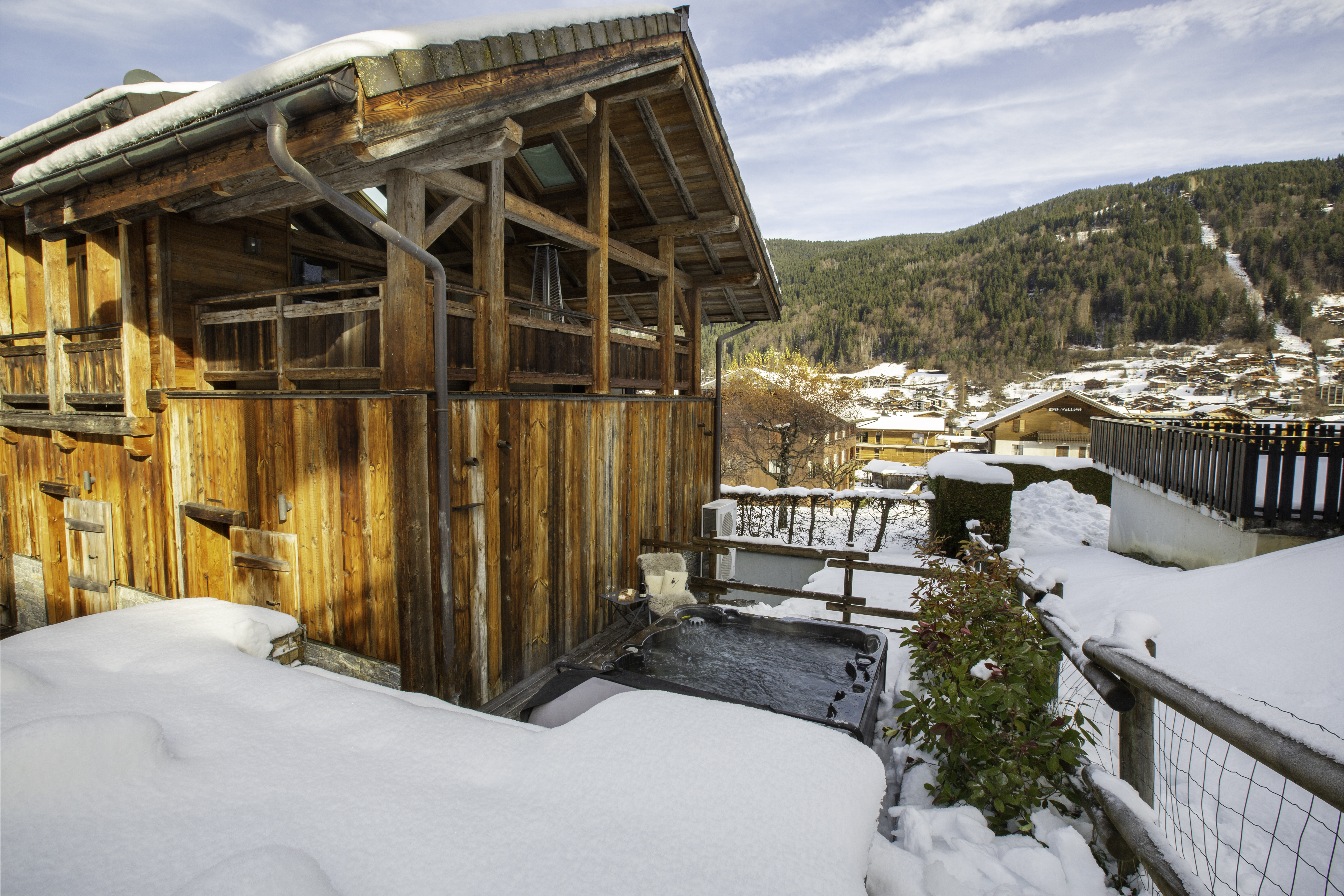 Stunning 3 storey Townhouse Chalet around 5 minutes walk to the centre of town and the Telecabines. Sleeps 8-10 people with Outdoor Hot Tub & Sauna and superb undercover, outdoor terrace with mountain views. 4 large bedrooms and 4 ensuite bathrooms.